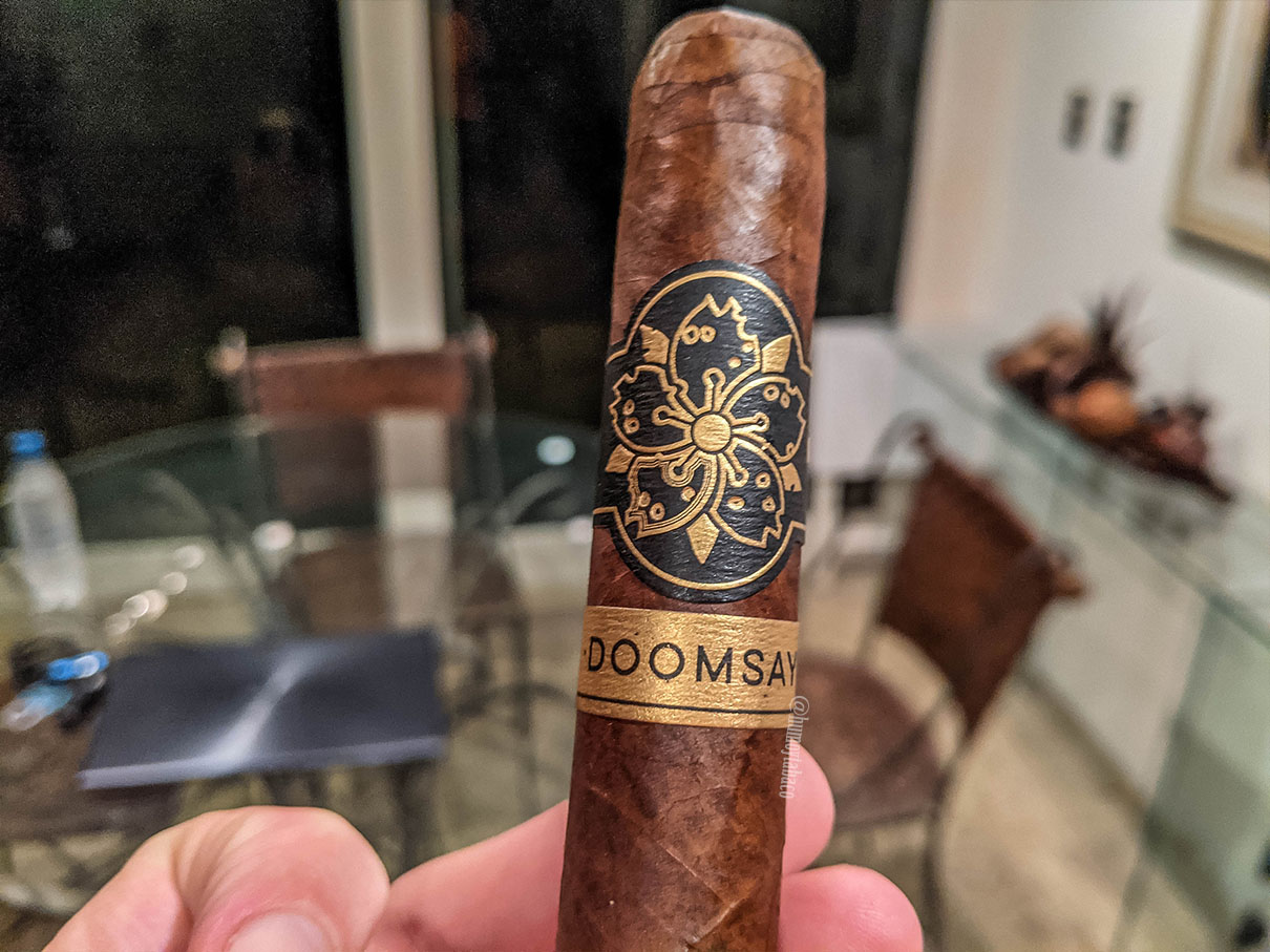 Visualmente este Doomsayer es un cigarro bastante llamativo y la anilla es espectacular, muy bien hecha y destacando la flor (de loto?) en ella y los colores que contrastan muy bien con el color de la capa, casi haciéndome temer lo que me pueda esperar. Sin embargo los aromas en frío tampoco son de temer, desprendiendo apenas una nota suave de chocolate y nueces en la capa, mientras que en el pie se siente una fruta como ciruela y la calada en frío presenta más chocolate, en el sentido que es más intenso que en la capa, cuero y nueces, así que en términos generales tengo aromas muy similares.