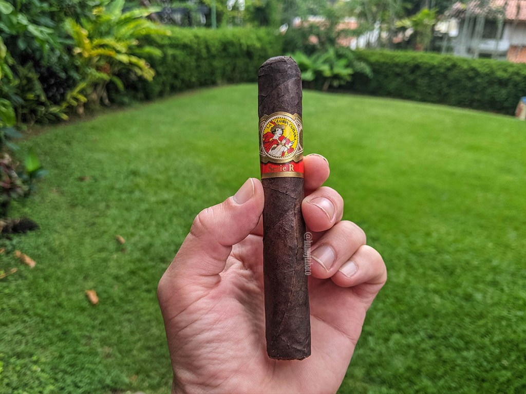 Efectivamente, este Serie R Maduro llegó como parte de un pack que me dieron por un bajo costo en Serious Cigars luego de una compra que hice. Originalmente probé su versión de capa natural Sumatra ecuatoriana en 2017 y el resultado fue menos que satisfactorio, pues le di un 71. Mis expectativas con este no están mucho más altas, especialmente porque el cigarro fue un regalo, prácticamente, pero todo tabaco pasa por al menos un par de años de preparación antes de llegar a tus labios y, por tanto, algo de respeto merecen. La capa de este Serie R es bastante oscura, muy olorosa, incluso si no tengo la nariz cerca del cigarro y puedo apreciar fácilmente aromas de establo y pasas, mientras que la calada en frío tiene notas menos intensas que las de la capa a chocolate negro y pan pumpernickel. Pero todos estos aromas son bastante habituales en cigarros de capa madura, así que hasta el momento no hay mayor sorpresa.