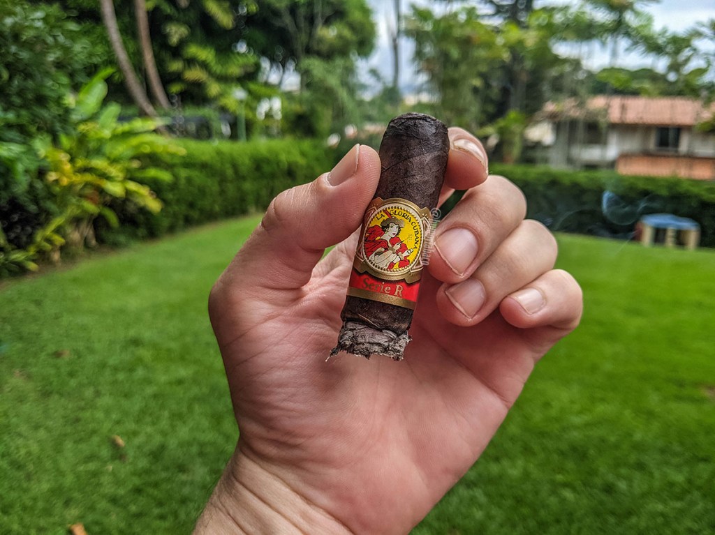 Las primeras caladas colocan al Serie R Maduro como un muy típico maduro, con un buen tiro, buen humo denso y abundante y sabores muy típicos de un cigarro maduro, como son chocolate negro, café y tierra, mientras que el retrogusto es una mezcla de canela y pimienta, pero es bastante suave en todos los puntos, colocando una intensidad entre suave y media, que es exactamente el tema que menos me gusta de los maduros. Sin embargo, es hacia el final del tercio cuando los sabores parecen tener un poco más de cuerpo y la intensidad aumenta un poco. En temas de construcción se comporta bastante bien, gracias a un anillo de combustión muy recto, ceniza sólida y una velocidad de combustión más hacia lo lento.