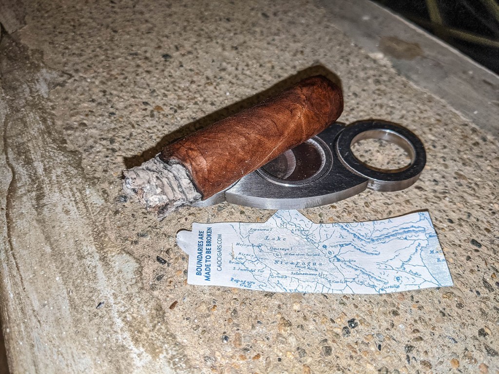En el último tercio los sabores se simplifican bastante y con eso no quiero darle una connotación negativa a la reseña, sino que simplemente los sabores no son tan interesantes y llenos de matices como en los tercios anteriores. Los sabores son simplemente de madera, paja y cuero, que fueron los sabores con los que empezó el tercio y se han mantenido durante toda la fumada, solo que hubo otros que llegaron hasta la misma intensidad de estos originales, mientras que el retrogusto es de notas florales y pimienta, aunque esta vez es roja y no blanca. Al cabo de dos horas exactas dejé el cigarro apagarse, aunque todavía le quedaba un rato, pero ya se estaba calentando y era algo tarde. Detrás de la anilla me encuentro con un mapa de Nicaragua en donde se pueden ver las regiones en donde se cultivan las hojas de la tripa del CAO Nicaragua.