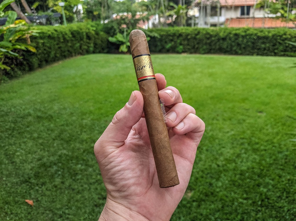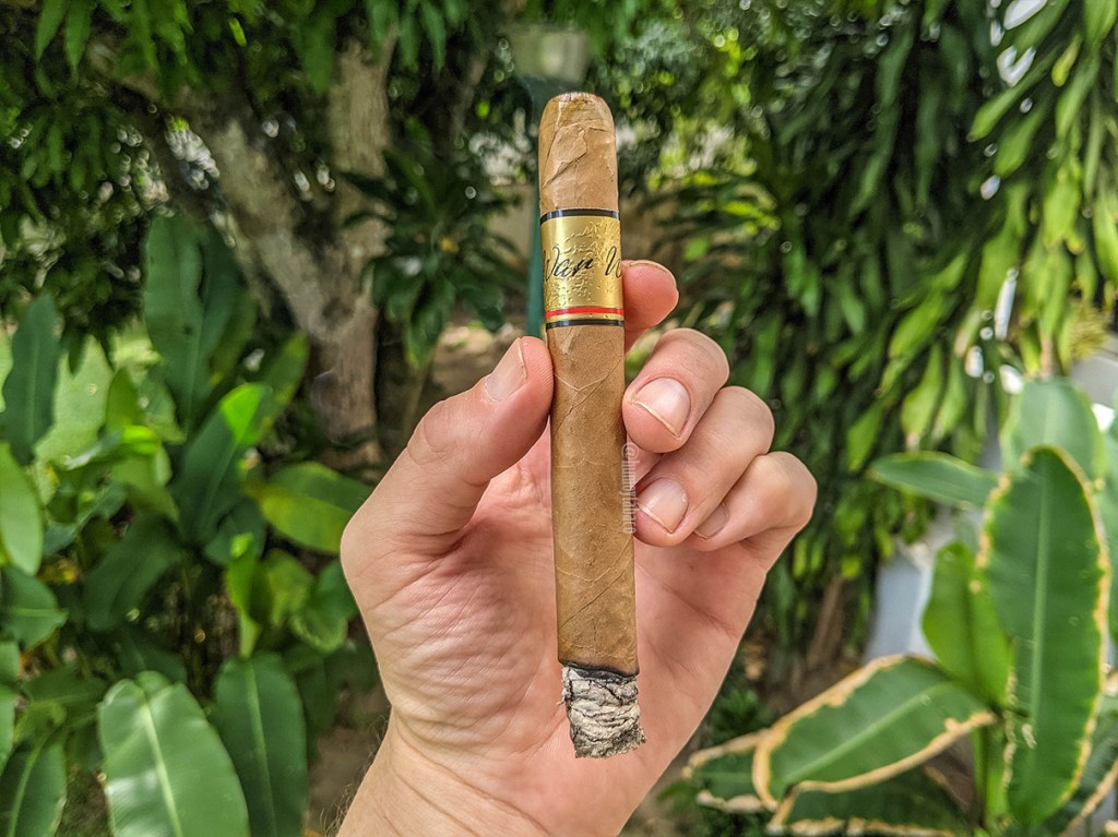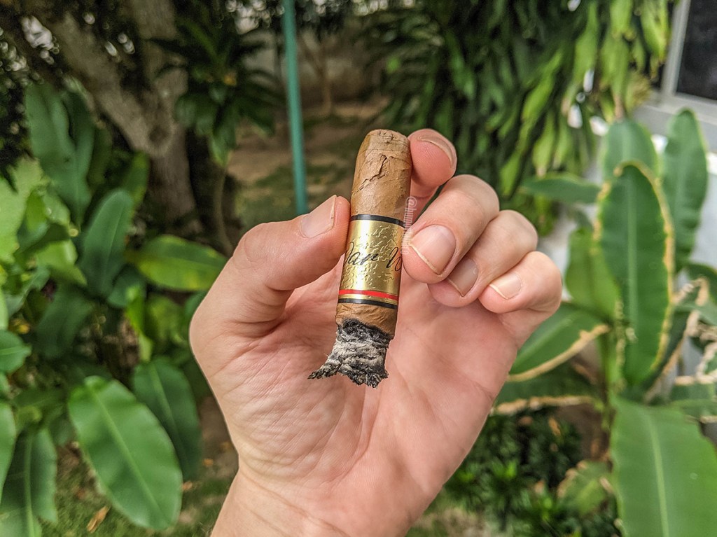 Los sabores del segundo tercio se ubican en el mismo orden y la misma intensidad en el último, pero esto no me molesta en lo absoluto, pues los dos tercios previos fueron maravillosos. La capa muestra una pequeña rotura justo por debajo de la perilla y perfectamente identificable en la imagen, pero siempre que incluya esa parte cuando me pongo el cigarro en la boca, no hay problemas y eso me ayuda a darle una calada más intensa al cigarro y poder probar mejor todos estos sabores deliciosos que incluye. La sensación seca en la boca y la garganta desapareció en el segundo tercio y al final el cigarro me duró casi dos horas, lo cual me pareció bastante impresionante.
