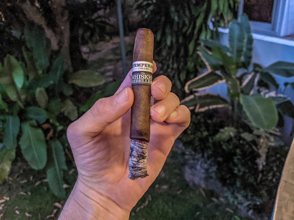 En el segundo tercio los sabores están casi todos al mismo nivel de intensidad, siendo la pimienta, madera y tierra los principales, pero este sabor de madera tiene un toque como entre ahumado y mojado que lo hace muy interesante y llamativo, pero realmente no consigo mejor manera de describirlo. También aparecen notas dulces en el tercio, como de pasas y maple, que son realmente la razón principal por la que quise hacer esta reseña, pues de un WR 1794 ya tenía y normalmente uno es suficiente, pero estos sabores tan atractivos y sutiles (al menos en este punto) y aparentemente sacados de la nada son algo que me encantó. El tiro es perfecto y la ceniza simplemente no se cae… incluso agito un poco el cigarro y tampoco se cae, pero como estoy seguro que se va a caer cuando le estoy dando la calada, prácticamente hago un esfuerzo adicional para que la ceniza caiga sin que eso afecte mucho la quemada. La intensidad es media-alta, y aunque eso es algo que espero con esta vitola, afortunadamente no sigue aumentando.