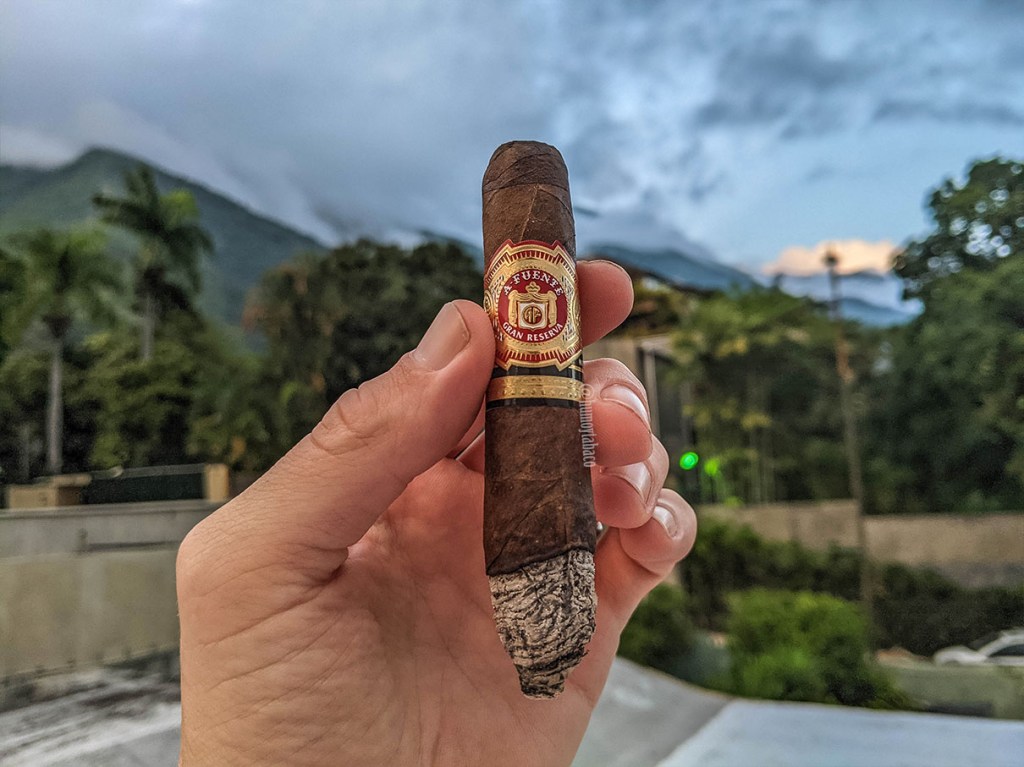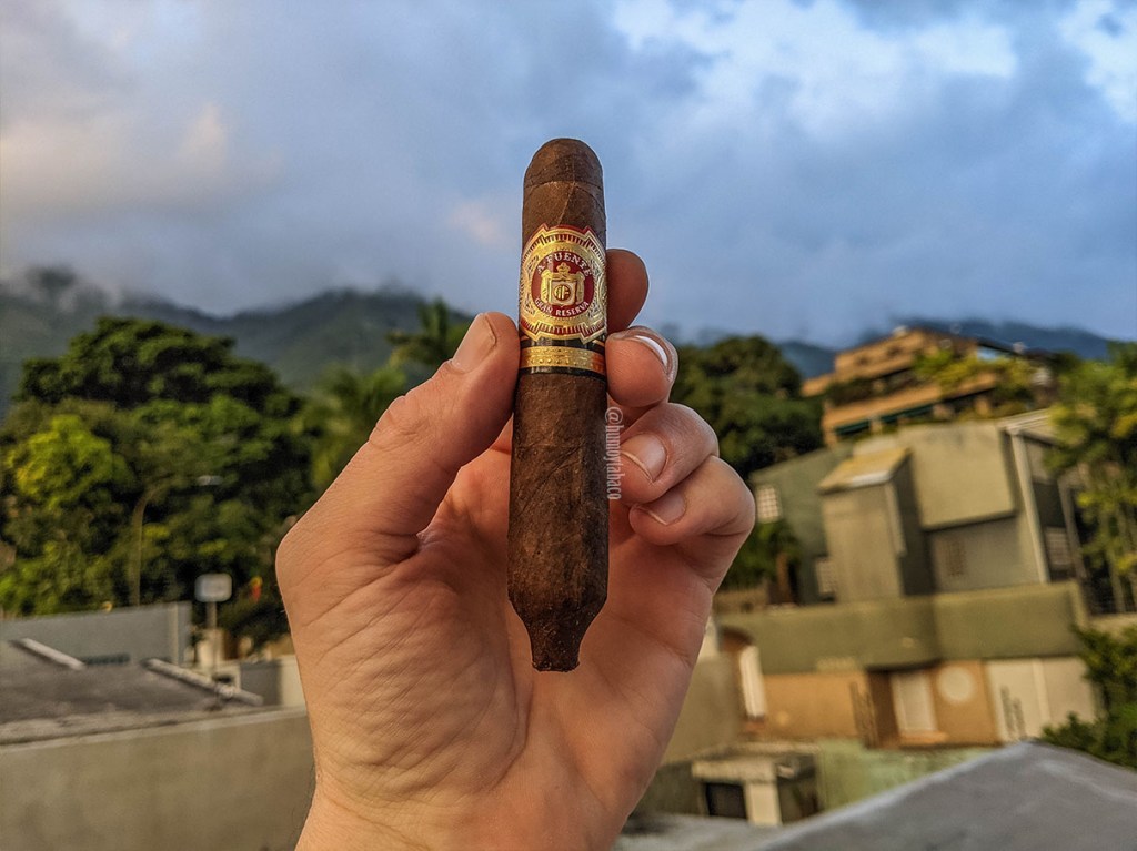 El cigarro en sí tiene el formato al que ya me he acostumbrado que es una especie de Perfecto, con una capa Cameroon muy distintiva y una enorme cantidad de protuberancias e imperfecciones que retan a esa idea de que esta capa siempre es perfecta y lisa. Igualmente, hay mucha gente que puede rechazar un cigarro porque no es perfectamente liso y en la mayoría de los casos esto se va a traducir en una experiencia más fuerte de la que un cigarro con capa lisa… ciertas condiciones aplican. Adicionalmente, una de las razones por las que estos pequeños cigarros tienden a costar más es que son bastante complicados de hacer, pero esa complicación se compensa con una experiencia espectacular y esta comienza con intensos aromas a madera y maní en la capa, junto con una ligera nota picante en la calada en frío.