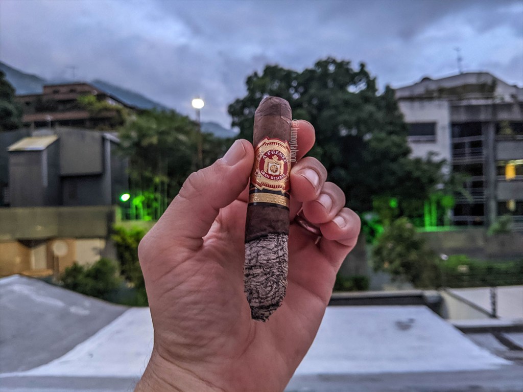 Dado que el último tercio tiene un cepo considerablemente menor que en el previo, el cigarro comienza a calentarse un poco, lo cual anticipo pero no me agrada y me apura un poco el final de la fumada, aunque tengo la alternativa de fumar más lento, pero eso es algo que suelo hacer en los primeros tercios y no al final. El sabor de café sigue siendo el principal, pero le acompañan unas notas cítricas muy agradables, que si le doy caladas muy rápidas se sienten como una mezcla entre ácido y cuero que no es lo que más me gusta, así que me veo obligado a fumarlo más lento para evitarlos. El resto de los sabores se mantienen iguales, aunque en el retrogusto el café se siente mucho más tenue y le acompaña ahora una suave nota de cuero y almendras, que mantiene hasta que dejo el cigarro; una hora y 15 minutos después de haberlo encendido.