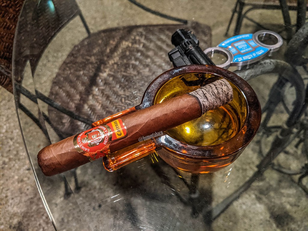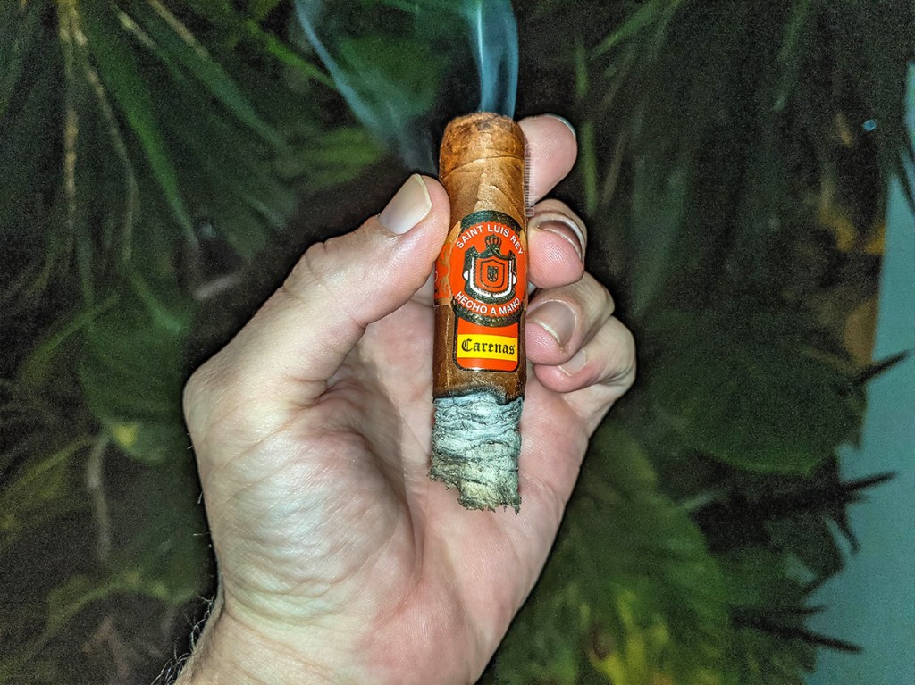 Pero si algo ha caracterizado mis experiencias con Saint Luis Rey es que rara vez han sido buenas y que tienen muy poco en su presentación que me lleve a pensar qué tal será la fumada; y la anilla de este es de esas que «no me dice nada». Sin embargo, se ve perfectamente torcido, la capa brillante, lisa y con aromas muy llamativos a chocolate y nueces. También hay una nota ligeramente ácida que no sé a qué atribuir, pero está presenta también en la tripa, acompañada de chocolate y pimienta. Finalmente lo pico y la calada en frío tiene muy suaves de chocolate y otras a frutas y la misma acidez, estas dos más fuertes que el chocolate. El tiro se siente un poquito apretado, pero espero que el calor del encendido resuelva eso.
