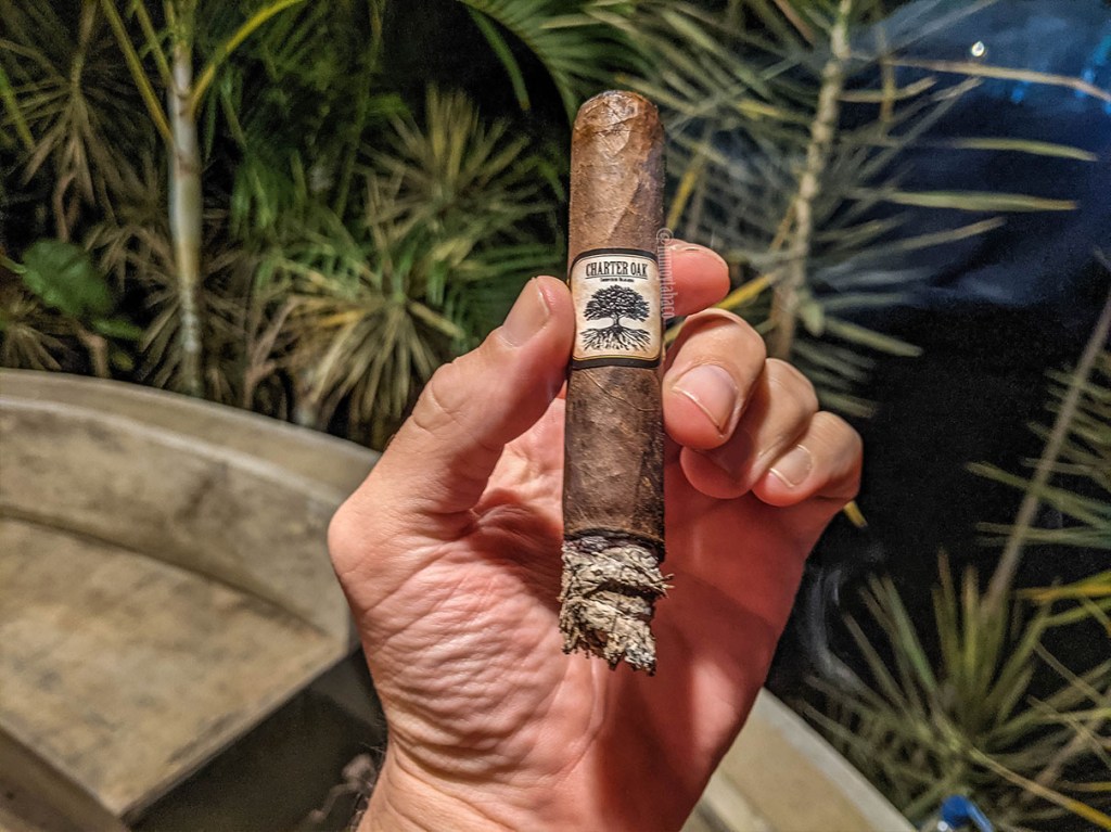 En el segundo tercio incluso hay una variación importante, pues el Charter Oak Broadleaf comienza a concentrarse más en sabores de madera y pimienta, y esa madera es más como de roble y la pimienta es más negra. El cigarro comienza a desprenderse de esos sabores de chocolate y es aproximadamente en la mitad de él que comienzan a aparecer especias como canela y nuez moscada, que no son del todo abundantes, pero le dan un toque de complejidad a la fumada. El chocolate se mantiene en el retrogusto, aunque su parte cremosa ya no se siente. La fortaleza del cigarro es media-alta y la intensidad de los sabores sigue en media, aunque el cigarro muestra un par de indicios en donde comenzaría a quemar mal, pero un retoque pequeño a tiempo lo corrige antes que pase a mal.