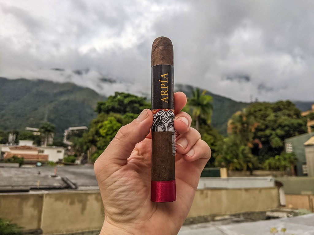 El segundo producto de Mythology Cigars; no porque el Sátiro haya sido previo, pues los dos fueron lanzados al mismo tiempo, pero el segundo que fumo. En esta ocasión tuve la oportunidad de probarlo en Toro y en Robusto, aunque la reseña será del Toro, pues fue el cigarro incluido en el pack mensual correspondiente a septiembre de Rumbullion Club. Según la marca, en la mitología griega Arpía era una mujer alada, de gran belleza y capaz de hechizar a quienes oían sus cantos. Se caracterizaban por ser retorcidas, perversas y de bajos instintos. En el argot venezolano se le conoce con ese nombre a las mujeres que son especialmente celosas y/o malignas con los hombres, o al menos los hombres que se victimizan fácilmente llaman así a sus novias, amigas y conocidas. En esta ocasión, su liga tiene una capa San Andrés mexicana sobre capote nicaragüense de Jalapa y tripa seco de Jalapa, viso de Jalapa y Ligero y Viso de Esteli