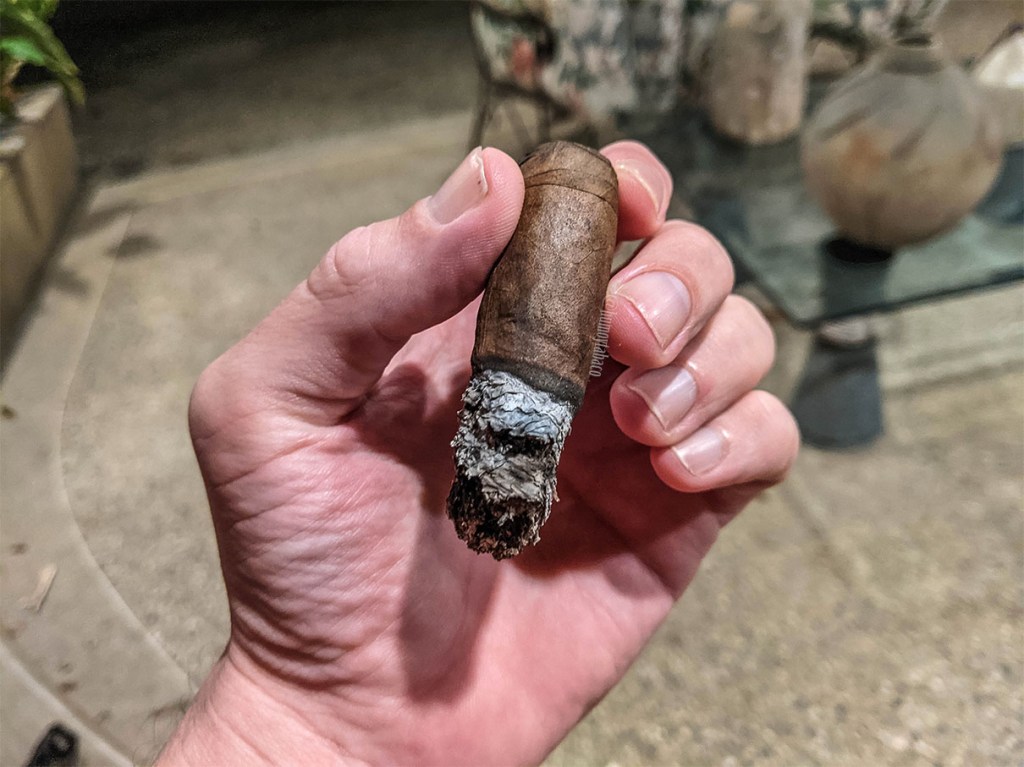 Aunque no se nota en la imagen, el Arpía es de gran calibre, con unas dimensiones llamativas que no tengo a la mano pero asumo que está en un 6×54 o por ahí. La explosión de pimienta impresiona y me toma desprevenido en las primeras caladas, desprendiendo bastante humo y en mis ojos bastantes lágrimas… creo que hasta se me agua un poco la nariz. Afortunadamente no es el único sabor y al cabo de las primera tres o cuatro caladas permite apreciar una nota densa y abundante de chocolate, que se funde con madera aproximadamente a la mitad del tercio, momento en el que incluye un sabor como a crema de avellanas, que en el retrogusto es solo de avellanas, pero con un fuerte componente de pimienta también. El tiro es fenomenal y el anillo de combustión bastante respetable.