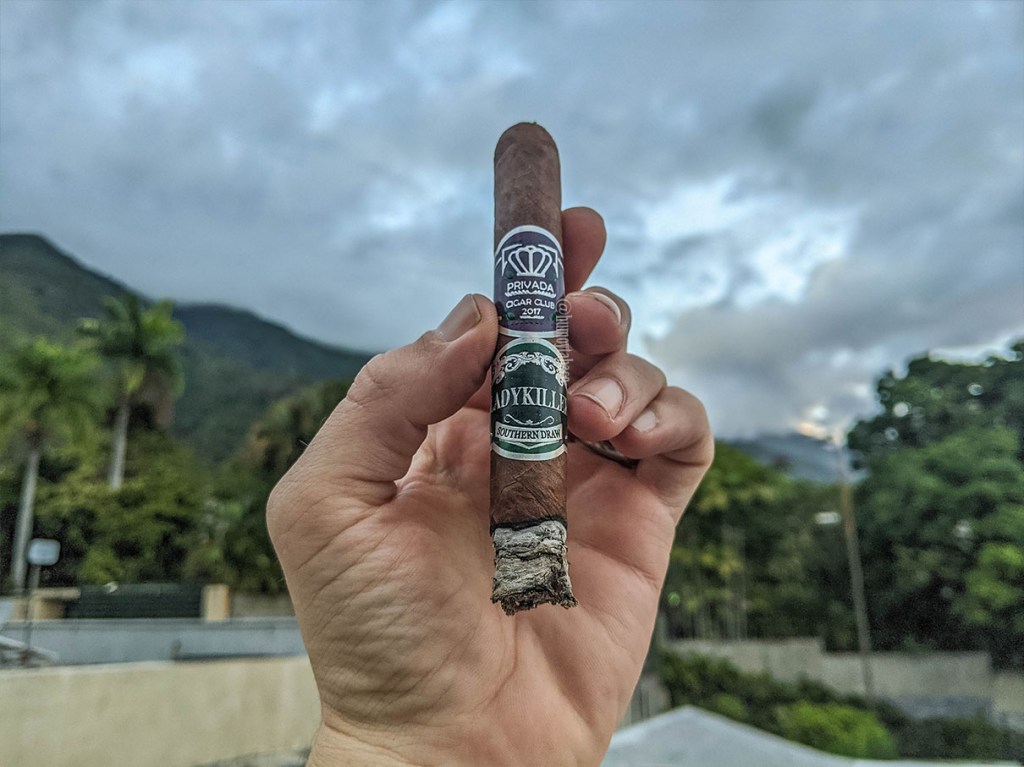 Para el segundo tercio los sabores del Ladykiller son casi todos distintos y nuevos, gracias a que los sabores de chocolate parecen desaparecer, teniendo en cuenta que eran de los más destacados en el primer tercio. En el segundo los más fuertes son de madera y cuero, pero a partir del punto medio del cigarro el café se siente en el paladar, sustituyendo ese de caramelo que había sentido antes y en el retrogusto comienza a dominar una nota de nueces que ciertamente no estaba antes ahí. Lo que sí se venía sintiendo en el retrogusto era pimienta y es a partir de la mitad de la fumada que se le siente un matiz de pimienta negra, que no es el mismo que se siente en la lengua, que voy a decir que es pimienta blanca porque ciertamente no guarda la misma fuerza ni se siente tan seca. Una que otra nota herbácea aparece a veces, pero no se queda suficiente tiempo para dejarse identificar bien. En términos técnicos, continúa muy bien, solo dándome un par de problemas cuando decido quitarle la anilla, pues me hace pensar que sí puede ser de 2017, pues es imposible que la anilla salga en una sola pieza y se rompe toda.
