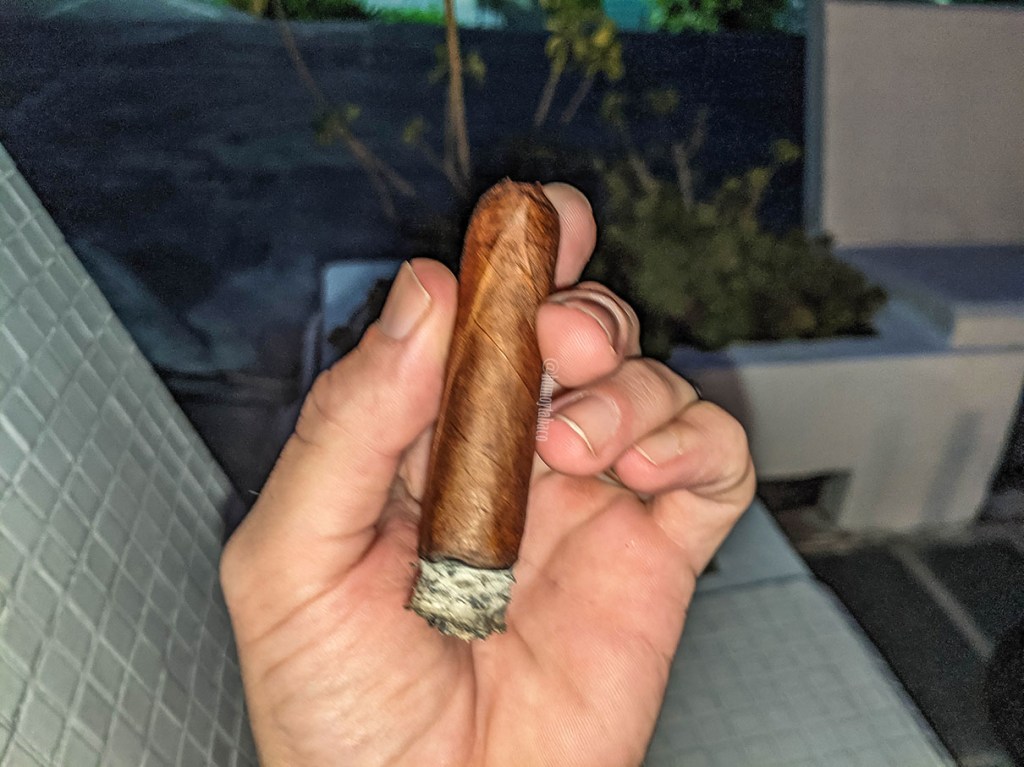 En el último tercio estoy conversando con un amigo mientras hago las anotaciones, razón por la cual la foto sale tan mal, además que no llevo puestos los anteojos así que no reviso después de haberla hecho. Pero el cigarro ciertamente está fantástico, con notas más destacadas de café en el paladar, en donde el sabor de caramelo regresa y sin duda alguna son sabores distintos, que me mantienen dando más caladas de las que debería. El sabor herbáceo se mantiene durante más tiempo y me hace pensar en yerbabuena, pero no hubiese podido percibirlo si no fuese porque la pimienta parece suavizarse un poco, particularmente la del retrogusto. El sabor de cuero es el que cierra los sabores del paladar y hacen que la experiencia sea realmente redonda, durante las casi dos horas que duró el Ladykiller.