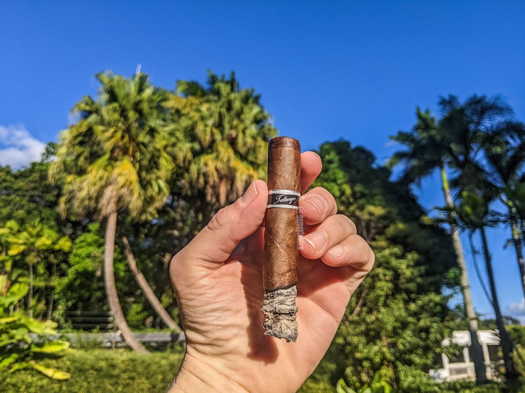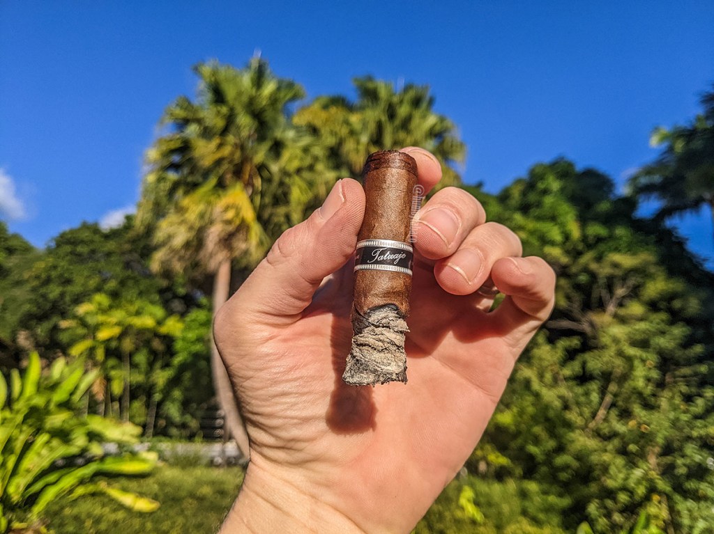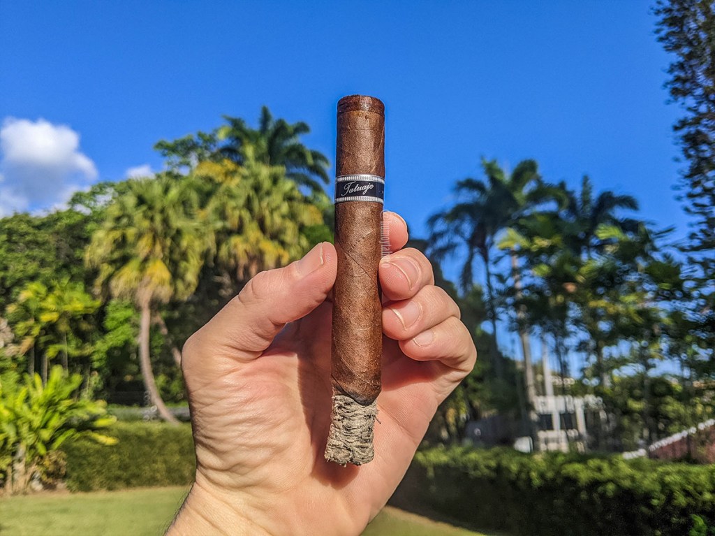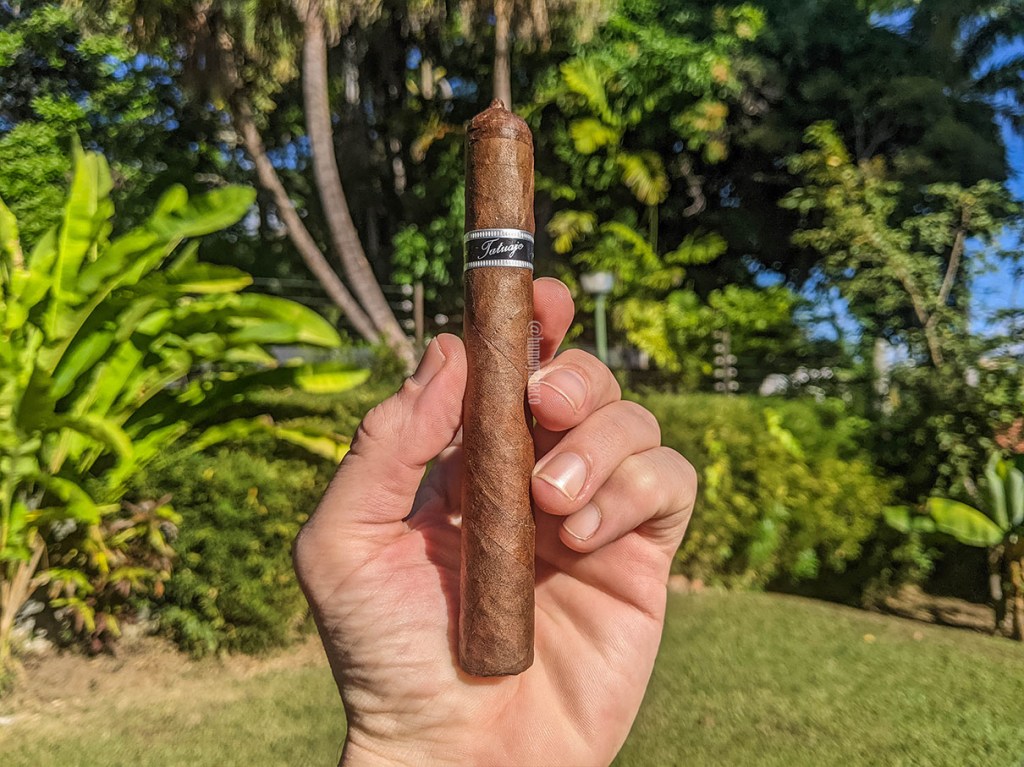 El cigarro es un puro nicaragüense con capa Criollo de Estelí que, según la leyenda, es una aproximación casi fidedigna de un cigarro de liga personal que Pete Johnson fumó de manera regular en una larga estadía que tuvo en Cuba. El cigarro tiene el pie cubierto y una perilla de «pezón» que suena mucho más bonito y menos gráfico en inglés: nipple cap. El color de la capa no es el típico cubano, pero tampoco estoy asumiendo que este cigarro va a saber a un habano, o al menos no es la esperanza que tengo. La capa lo que sí tiene es que se siente bastante rústica, con varias imperfecciones, venas y protuberancias, aromas fuertes a chocolate, pimienta y notas frutales. En el pie huelo la capa, pues es cubierto, pero la calada en frío tiene notas igualmente fuertes, esta vez a cuero dulce, pimienta y más dulce, haciendo un contraste interesante antes del encendido.