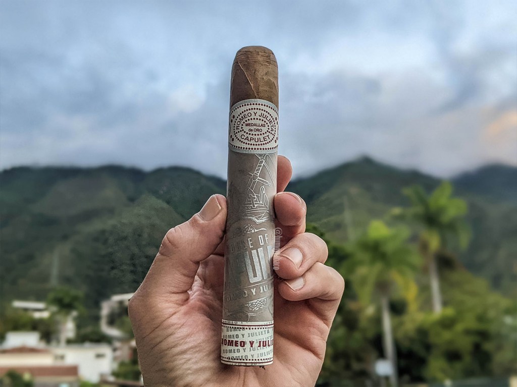 Me toma una hora y 15 minutos llegar a la mitad del cigarro, lo cual me parece bastante, sobre todo con un cigarro que despide tanto humo en cada calada y que se mantiene consistente con los sabores del primer tercio, a una intensidad ligeramente mayor pero que sigue siendo sutil. Mientras me aproximo a la mitad aparece un sabor como de torta, o mejor dicho a ese ponqué (pound cake) que hace de relleno de las tortas de cumpleaños, muy agradable y con un alto contenido de vainilla y alguno que otro segmento con algo de pimienta, pero suficiente para no temer hacer una que otra calada que sea únicamente por la nariz. El House of Capulet sigue quemando bastante bien, lento y constante.