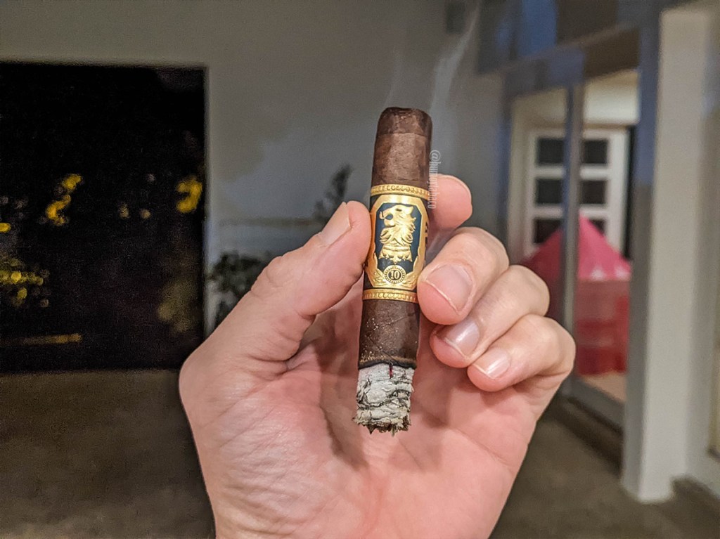 Realmente me distraigo y para cuando me doy cuenta que no tengo fotos del último tercio, estoy en los últimos momentos del cigarro. Los sabores en esta fase final siguen siendo chocolate negro con notas florales y pasas en el retrogusto como los más fuertes, con sabores adicionales y en menor escala a café ácido, cedro, canela, y pan. El tiro sigue siendo muy bueno pero se me ha apagado un par de veces y lo mantengo encendido dándole caladas muy regulares. La fortaleza es mayor en este tercio pero cuando cuento con una hora y 35 minutos, que es una grosería para un corona, el Undercrown 10 llega a su fin.