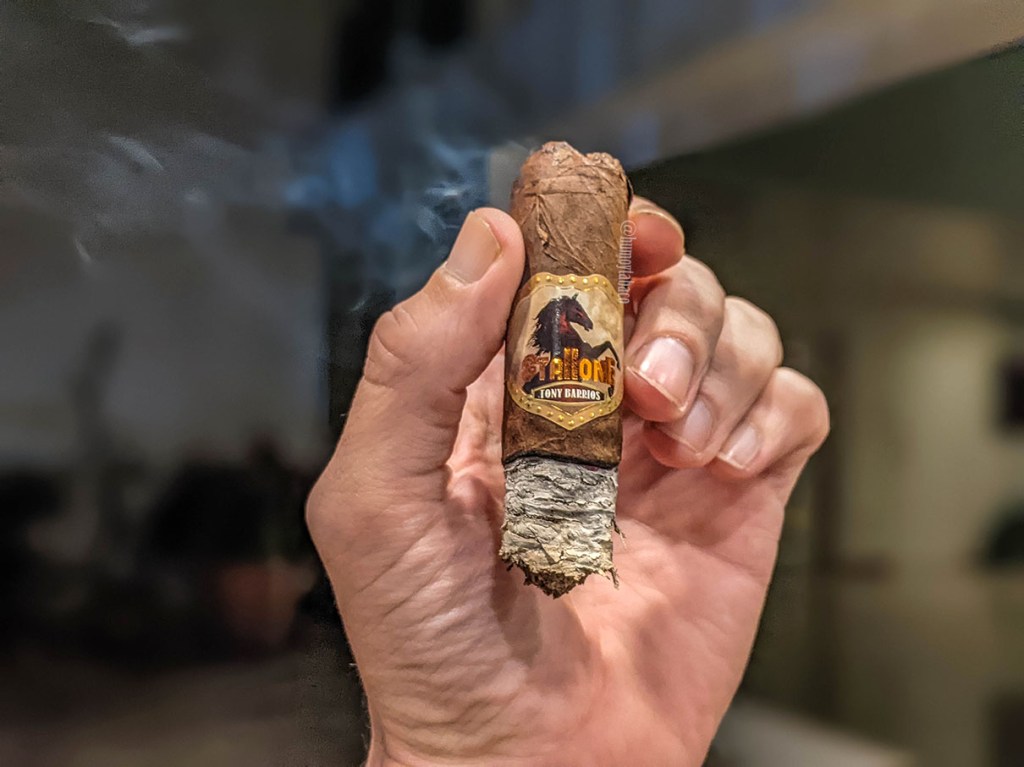 Así serán las dimensiones de este cigarro, que la cámara no enfocó todo y en la parte superior sale borrosa. Pero lo primero que me sorprende del Clydesdale es que no me recibe el bombazo de pimienta que esperaba en la primera calada, sino una sensación intensa de sabores que apenas si incluye una nota suave de pimienta. Los sabores son complejos desde el primer momento, con notas de café tostado y chocolate blanco y es cuando la quemada comienza a acercarse a la capa que aparece ese bombazo de pimienta. Afortunadamente no abruma ni es algo que me haga llorar los ojos, pero sí que se coloca entre los primeros sabores sin mucho merodeo. La intensidad de los sabores es alta, como prometía Tony, pero la fortaleza del cigarro, al menos por los momentos, no lo es tanto. Hacia el final del primer tercio, el cual me toma casi 45 minutos, los sabores son de café tostado, chocolate blanco, almendras, maple y establo, con un retrogusto de chocolate negro, leña, pimienta y paja.