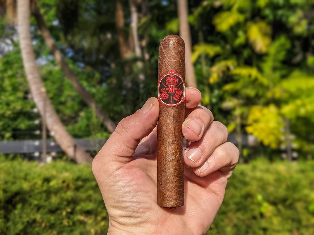 Esta marca Stolen Throne es una de la que no he probado mucho, pero realmente lo que he fumado me ha encantado. Hace unos años tuve la suerte de probar uno llamado Crook of the Crown y me pareció increíble y no es un cigarro demasiado caro, pero su producción limitada ha hecho que sea difícil coincidir entre que tenga dinero, me acuerde y esté disponible. Pero hace unos meses se alinearon las opciones y compré ese y este Three Kingdoms, que vino muy recomendado por la página: Cigar Federation. Se trata de un cigarro con capa Habano oscuro ecuatoriana sobre capote y tripa nicaragüenses. Las ligas son creadas por Noel Rojas, quien al igual que estos cigarros ha hecho otro que me gustó mucho, que se llama Project 7.