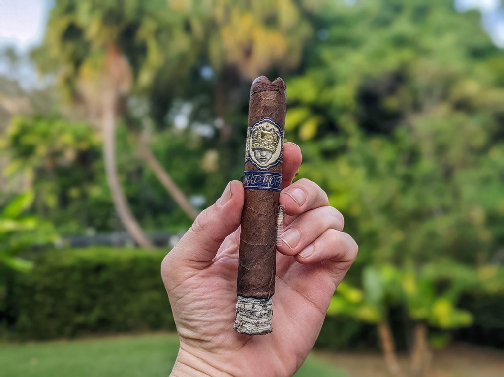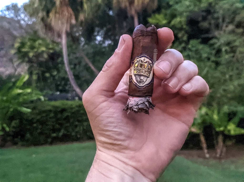 El Long Live the King Mad Mofo es exactamente lo que espero de un maduro, al menos en las primeras caladas: fortaleza media, sabores de intensidad media-fuerte a tierra, dulce y chocolate. También hay una nota de pimienta bastante destacada, cosa que aprecio pues es algo que le falta a muchos maduros. Esta pimienta no es fuerte, pero sí le da una personalidad o un toque necesario al cigarro y me distrae un poco del hecho que la ceniza se está pelando. La pimienta no parece estar muy presente en el retrogusto, en donde me encuentro con más notas de tierra que de cualquier otro sabor. La ceniza no es del todo sólida, aunque tiene un buen color y el anillo de combustión es sobradamente recto, con buen tiro aunque un tanto más abierto de lo que quisiera.