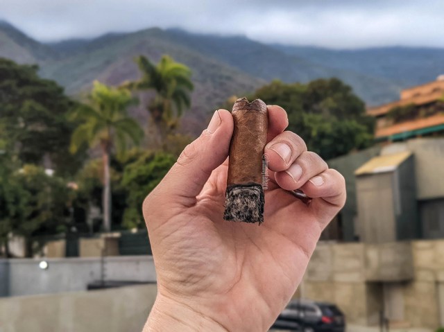El último tercio duró más o menos hasta donde se ve en la imagen, pues el tiro se hizo más apretado y ya llegó al punto que no estaba disfrutando de la experiencia. Los sabores también sufren por este problema de tiro e incluso un dolor de cabeza me despierta, sin duda por el esfuerzo de las caladas que no dan mayor resultado. Café quemado y pimienta son los sabores, pero en todo lo demás el resultado de la fumada está bien: anillo de combustión y reencendido cuando se apacigua un poco la llama. Pero sería absurdo evaluar el último tercio si no alcancé a fumarlo.