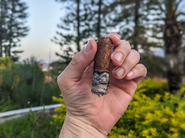Como creo que es obvio en la imagen, el anillo de combustión y quemada en general no es lo mejor del cigarro, especialmente se nota en esa flor que se hace a partir de la ceniza, pero al menos en sabores compensa y en el segundo tercio regresan esos sabores dulces, aunque mucho menos notables. También hay una mejor definición del sabor de madera, que comenzó el cigarro como roble, luego se volvió madera genérica y ahora vuelve al característico del roble, mientras que las notas saladas y de grama recién cortada se colocan entre las secundarias y a partir de la mitad incluyen algo de tierra también. No es lo que llamaría un cigarro complejo, pero la variedad de sabores y la densidad del humo mantienen la fumada interesante, aunque el anillo de combustión deje mucho que desear.