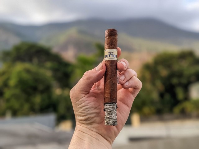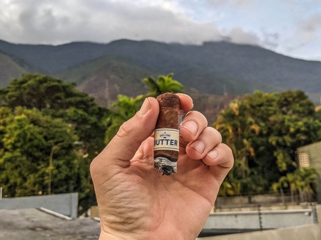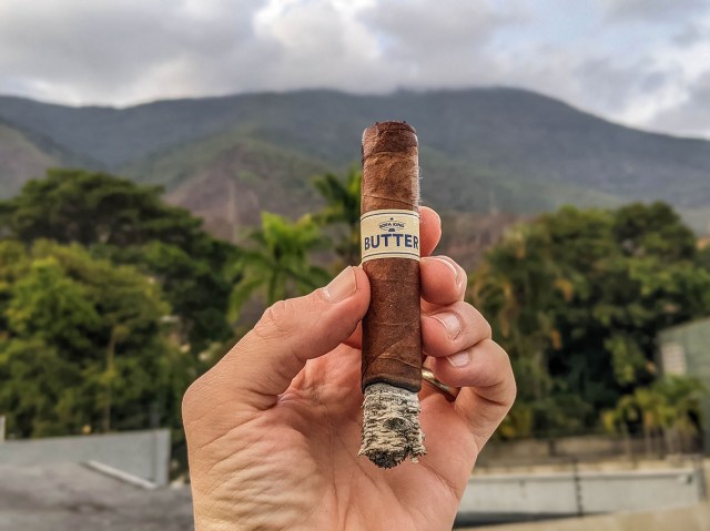 El Butter Maduro comienza con excelente tiro y una ceniza que se sostiene perfectamente sobre el cigarro. Los sabores no son muy variados, pero con su índice de precio (alrededor de $6 por unidad), no esperaría mucho más. Algo que me impresiona inmediatamente es el poder de la predisposición, y es que si el cigarro se llama Butter, ¿a qué crees que sabrá? La respuesta no es mantequilla, pues ciertamente no es el sabor, pero si alguna vez has comido mantequilla sola, pueden haber similitudes. El hecho es que al cigarro se le siente una nota salada bastante predominante sobre los sabores y hay una sensación oleosa en el paladar y la lengua, como si hubiese comido mantequilla o margarina. Los sabores entonces son de madera seca, un ligero cítrico que se siente más en retrogusto, y esta nota oleosa y salada que domina la fumada.