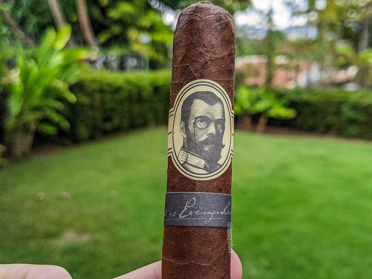 Un producto lanzado por Caldwell en 2015, quizá uno de sus primeros productos o al menos en mi corto historial como fumador siempre he visto este cigarro como una rareza. No llega a ser unicornio, pero no es común tampoco. Lo probé por primera vez hace casi 3 años, en un ambiente casi perfecto, poca brisa, buena temperatura y rodeado de agua, pero no me gustó del todo. Fue en otra vitola, más pequeña, así que cuando logré conseguirlo nuevamente en toro, decidí aprovechar la oportunidad. El The Last Tsar fue una de las primeras ediciones limitadas de Caldwell, con una imagen del zar Nicolas II, efectivamente el último zar de Rusia. Se le forzó a abdicar en 1917 luego de la revolución rusa y un año después tanto él como su familia fueron ejecutados por los bolcheviques. En cuanto a la liga, según Robert Caldwell, este cigarro tiene la misma capa del Eastern Standard, pero esta es fermentada un poco más.