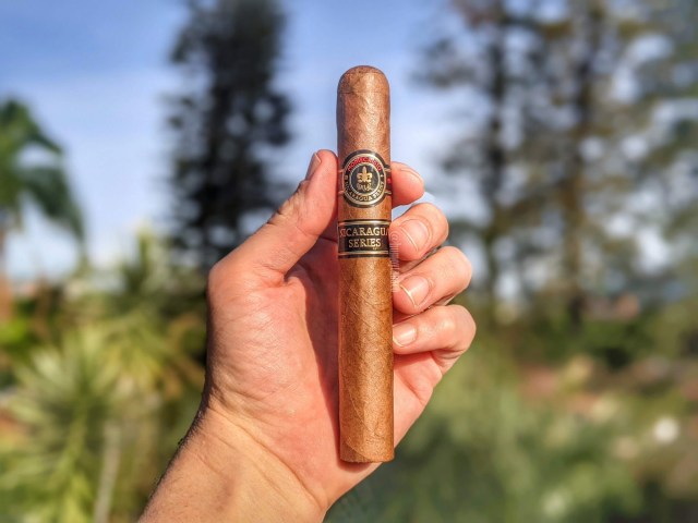 El Nicaragua Series no solo es producido en Nicaragua en la fábrica de AJ Fernandez, se trata de un puro nicaragüense, aunque no especifica qué tiene en cada sección. El cigarro está disponible en 4 vitolas, que incluyen un robusto 5×54 y este toro 6×54 y todo lo demás es más grande, apoyando mi teoría que los cigarros de AJF están ideados para ser toro y viene siendo la vitola ideal para probarlos. La capa es ligeramente rojiza, llevándome a pensar que se trata de un colorado habano, pero la descripción del cigarro simplemente la coloca como «Nicaragua». Tiene una cierta oleosidad, lo que le permite brillar ligeramente y desprender aromas a cuero viejo, madera y establo, mientras que a calada en frío presenta chocolate y tierra. Lo pico con la doble hojilla y me encuentro aromas a durazno, tierra y pimienta.