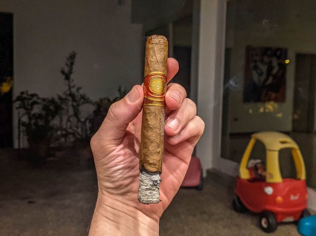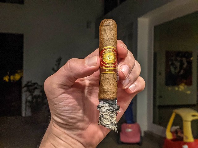 El último tercio lo extiendo lo más posible porque realmente es delicioso y porque estuve unos 10 días sin fumar y un cigarro de estas dimensiones me pega más de lo que quisiera luego de esta ausencia. El sabor de tierra sigue dominando, pero le acompaña un sabor de café casi al mismo punto de intensidad y por detrás le siguen notas de madera de roble y frutos rojos. La pimienta sigue presente, pero pareciera tener un delay, en el sentido que la siento en la lengua pero cuando ya estoy probando el retrogusto del cigarro. Mi ausencia de fumada también llevó una ausencia de alcohol, por lo que estoy fumando con agua gasificada y el chispeo en boca posterior a la fumada es increíble. No obstante, los problemas de quemada se mantienen aunque en menor regularidad y al cabo de una hora y 40 minutos finalmente lo dejé descansar en paz.