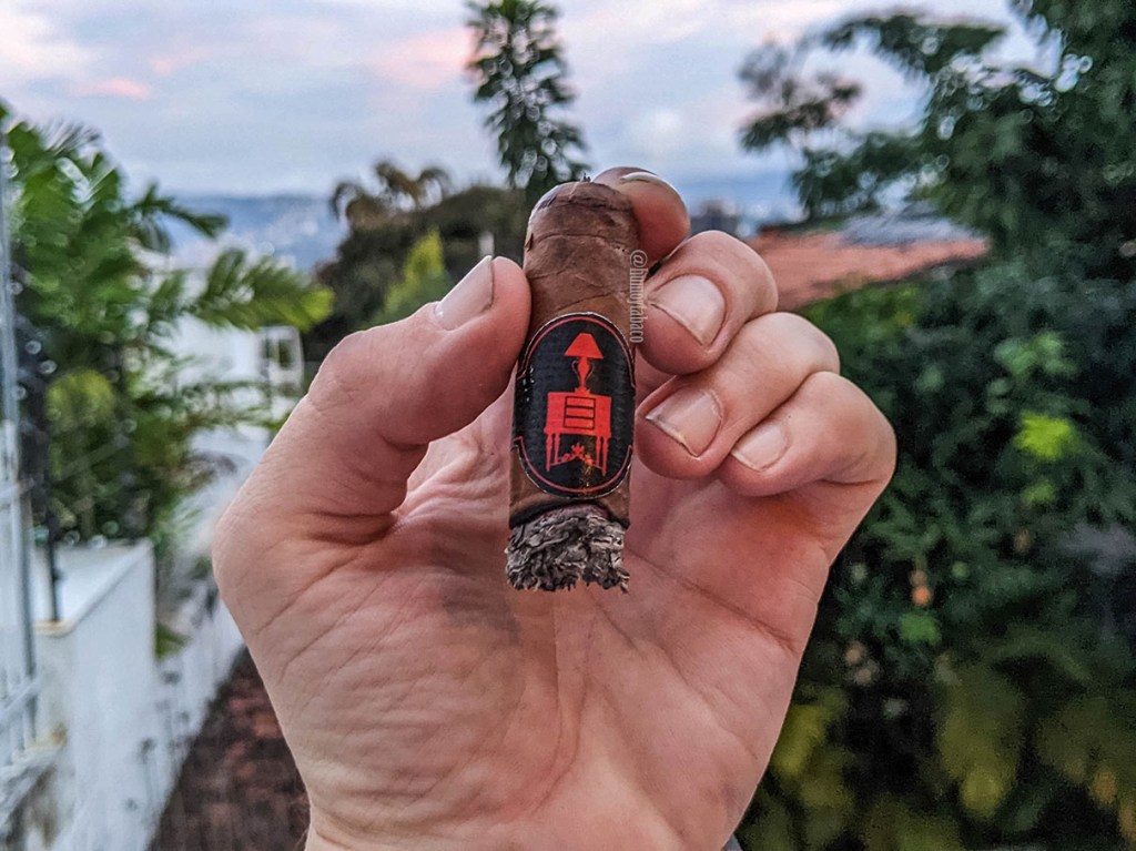 El cigarro enciende rápidamente gracias a un tiro muy decente y al hecho que solo tiene 50 de cepo, y sus sabores son abundantes a chocolate negro, madera y más suave de lo que esperaba de café, pero nuevamente es esa sensación de café molido que el que ya está colado. El sabor de madera se va colando a la cabecera del resto de los sabores del cigarro, junto con el chocolate, la verdad es que es una combinación agradable. Sin embargo, hay notas amargas en la fumada, sobre todo si le doy caladas seguidas y con el anillo de combustión tan accidentado que tiene, estoy obligado a tratarlo con mucho cuidado, pues hay que conseguir un delicado equilibrio entre no fumarlo muy rápido y mantenerlo encendido. El tiro está bien y quema un tanto más rápido, precisamente por ese equilibrio que hay que encontrar.