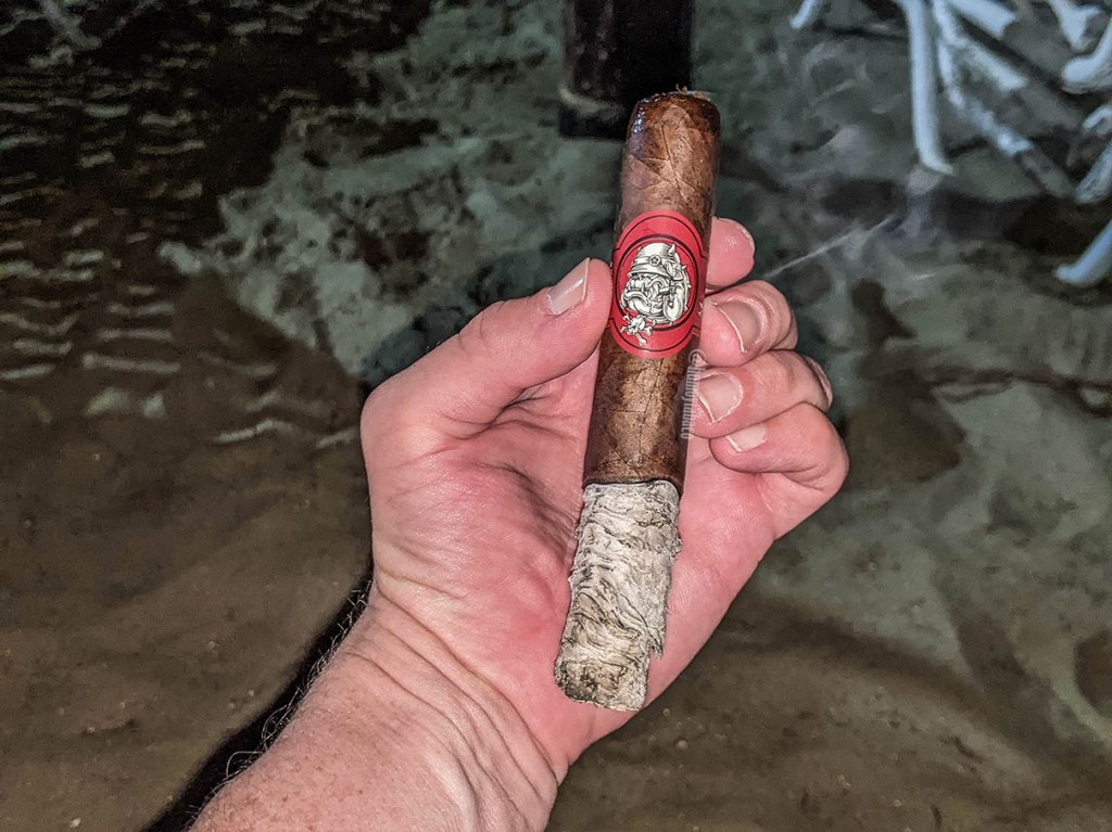Para ser un cigarro de tripa corta, con un costo menor a $3 por unidad, el Teufel Hund Maduro sostiene una ceniza respetable y teniendo un cepo de 55, es más o menos lo que esperaba. Insisto, con poca brisa y poco movimiento, es natural que una ceniza se sostenga un buen tiempo, aunque hay cigarros que simplemente se niegan a ello. Los sabores son los mismos de chocolate, paja, pimienta y tierra, pero ya la lengua no pica tanto y la tierra se siente como un sabor más existente y presente, versus una nota ligera y casi perdida en la sección previa. La quemada mejora marginalmente, pues sigo pendiente de ella con el encendedor a la mano, pero el tercio parece durar más y llegar a la mitad del cigarro me toma 40 minutos.