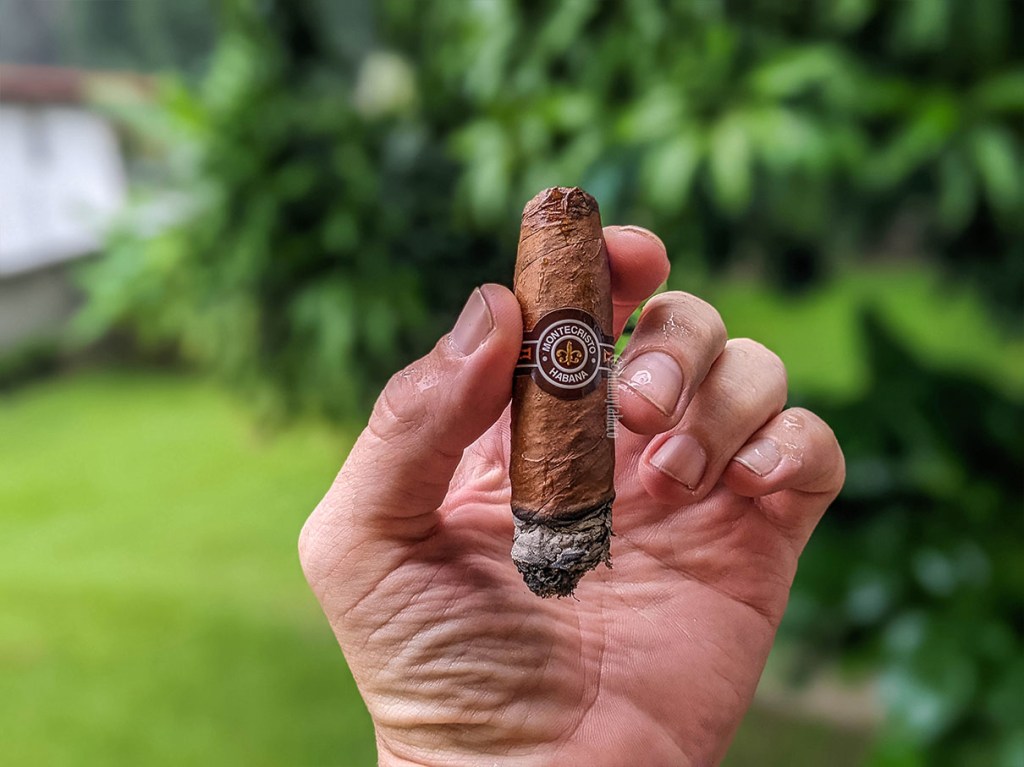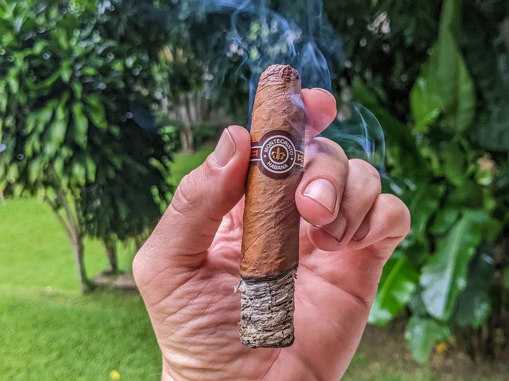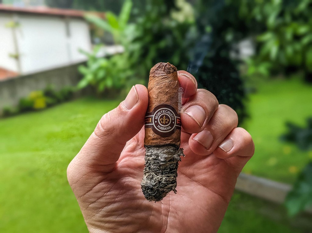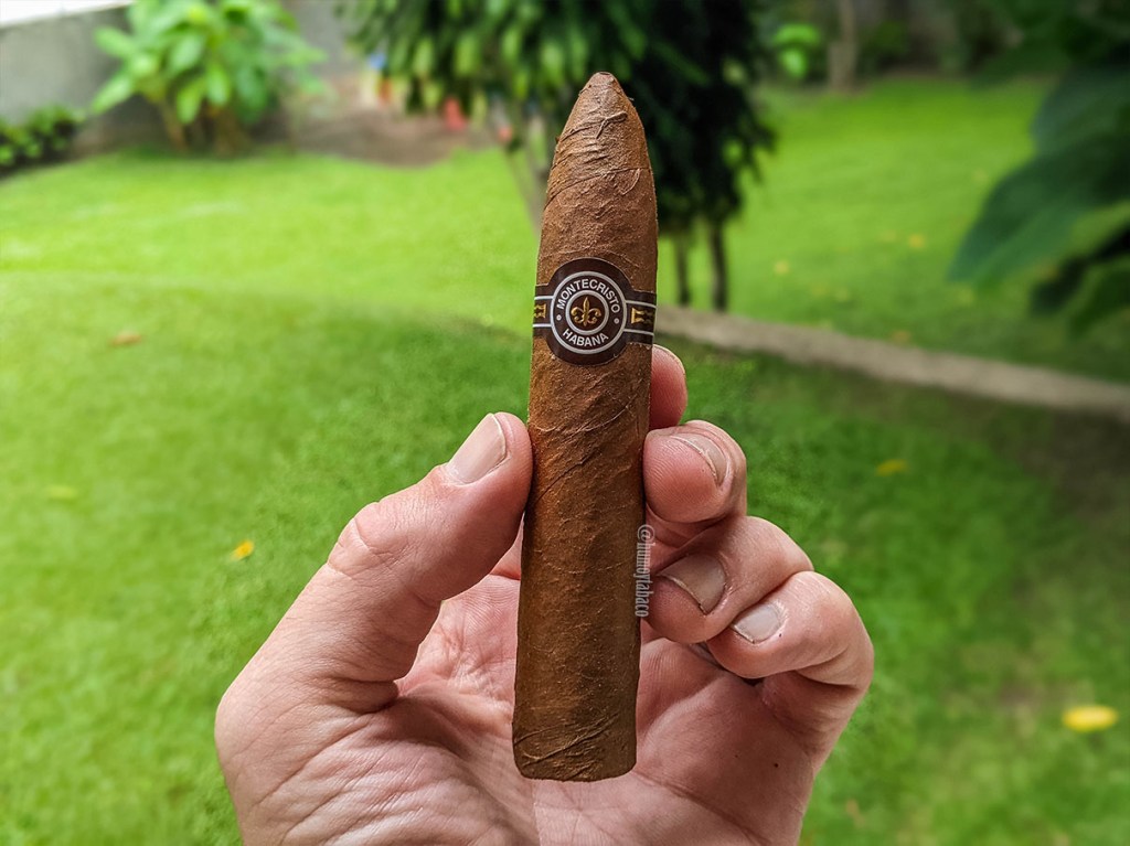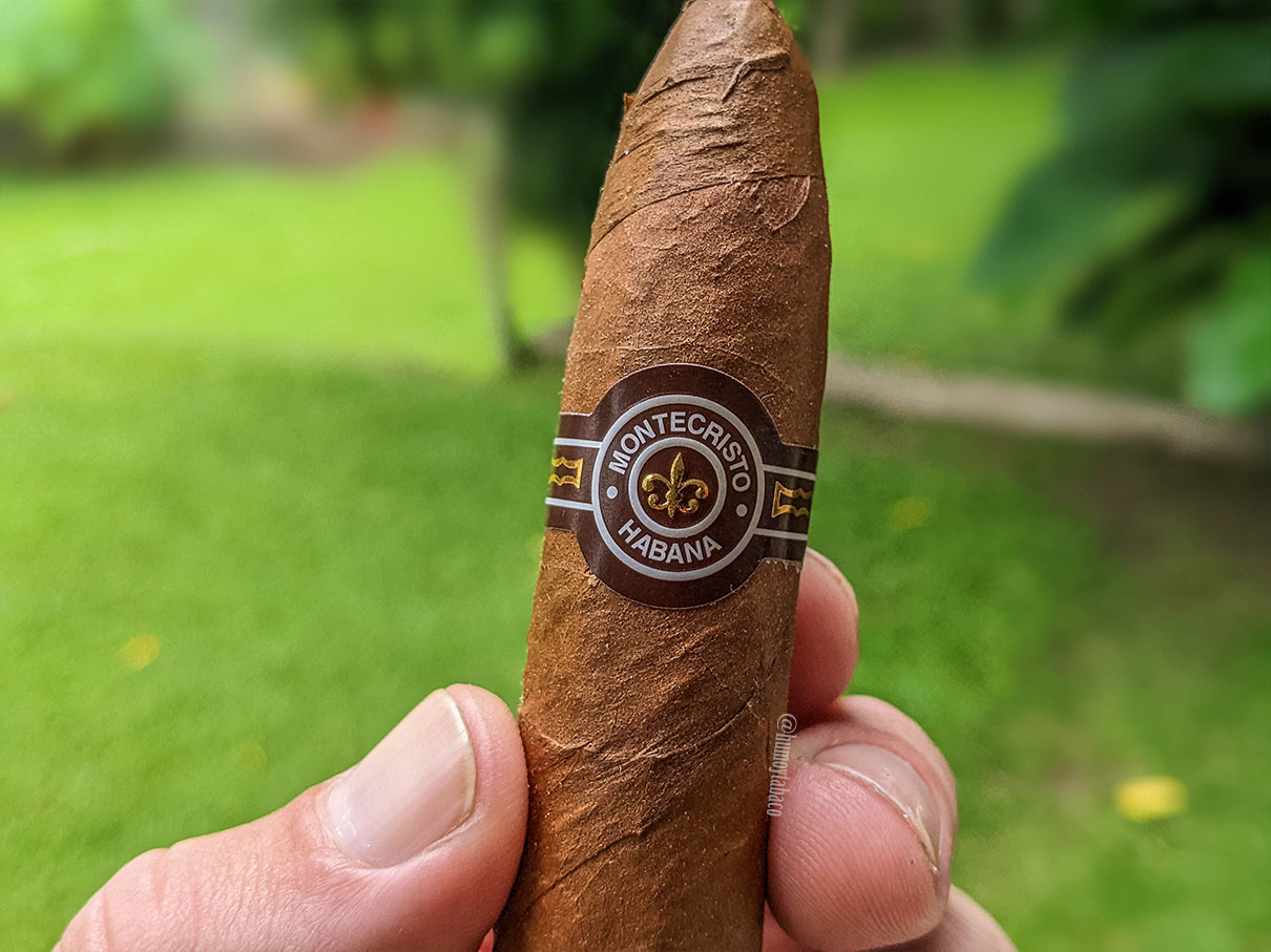 Hace unos meses tuve la oportunidad de ser parte de la organización de la velada de lanzamiento para Kukenan Tobacco en Venezuela, la empresa autorizada por Habanos S.A. para la distribución y venta (al mayor) de habanos en este país. En esa ocasión lo que hice fue proponer las bebidas que tomar junto con el habano que Kukenan colocaría. Aunque en la propuesta final este habano fue el H. Upmann No. 2, en la propuesta original estaba este Montecristo de la reseña. Sin embargo, luego de probarlo, los amigos de Kukenan me dijeron que mejor no, pues en ese momento el cigarro no estaba listo. El cigarro tiene dimensiones de 4,7 pulgadas y un cepo 52, que al ser habano solamente es identificado el país de origen de las hojas pero no qué parte de la planta son. Coincidentemente, este cigarro es hecho en la misma fábrica que el H. Upmann.