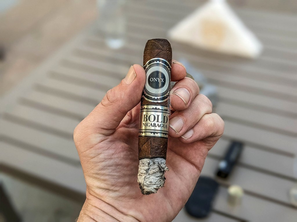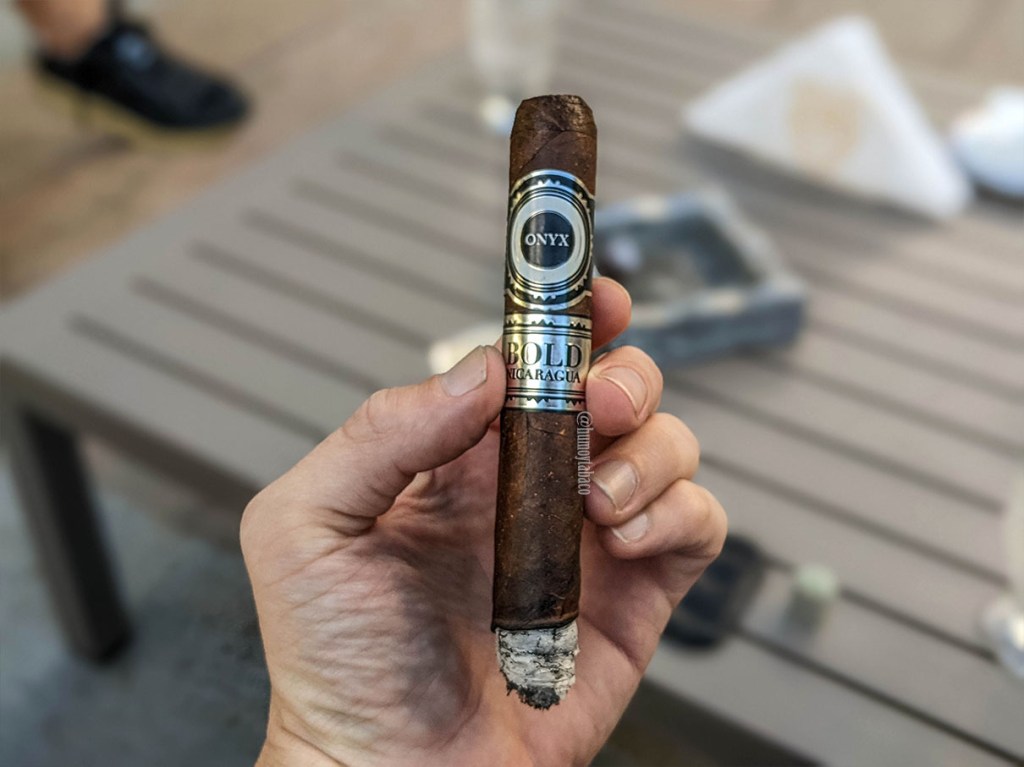 El Onyx Bold Nicaragua comenzó con una ceniza perfectamente cuadrada, pero haciendo una de las fotos el cigarro se deslizó sobre la mesa y eso hizo que se le cayera la parte superior. Los sabores comienzan relativamente tímidos y escasos, con una cantidad considerable de pimienta seguida de madera mojada, y notas más sutiles de esa pimienta en el retrogusto. No es lo que llamaría Bold, como indica su nombre, pero tengo la sensación de que llegará pronto a serlo, pues si es hecho por AJF, no puede quedarse en eso y se siente que habrá una evolución. Esta llega a los pocos centímetros, más o menos para cuando hago la foto, con notas de carbón de parrilla y tierra seca, con notas un tanto más suaves a café. No hay mayores cambios durante el tercio, mientras que en construcción se comporta relativamente bien, aunque la ceniza tiende a soltar pedacitos de manera regular y eso me lleva a no querer mantener una gran columna. Sabores de intensidad media y fortaleza igualmente media.