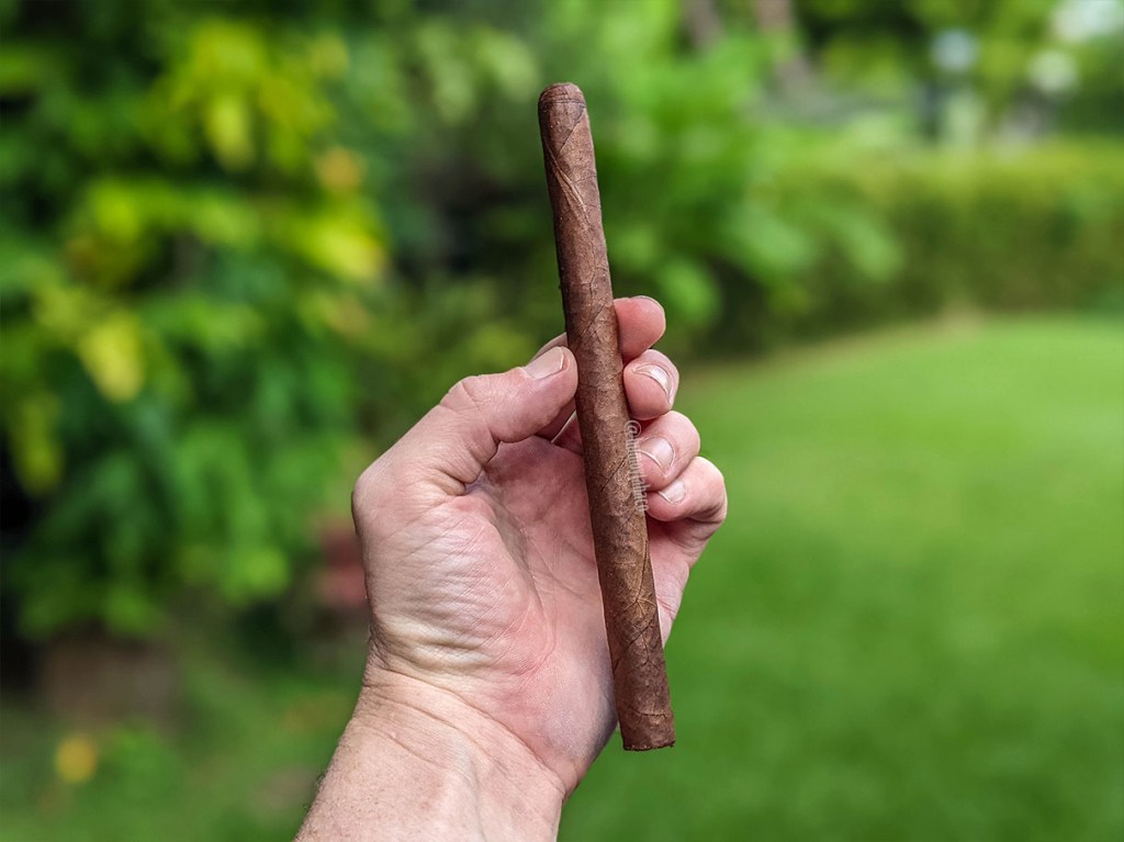 En verdad se ve imponente y normalmente con un cigarro de cepo tan pequeño, es difícil que se vea como una propuesta agresiva, pero su peso realmente sorprende. La capa es relativamente lisa para ser mexicana, con colores muy similares de un extremo a otro y aromas muy típicos de San Andrés, como la tierra mojada, notas de pasas y un toque suave cítrico. La calada en frío no tiene nota alguna de pimienta y el hecho que el capote y la tripa de Lalibela es nicaragüense me invita más a fumarlo porque sería otro cigarro más de Nicaragua que no tiene notas tan picantes como a las que estoy acostumbrado. Lo que sí se aprecia en la calada en frío es establo, chocolate y una cierta nota salada mineral, con lo que parece que será un buen tiro.