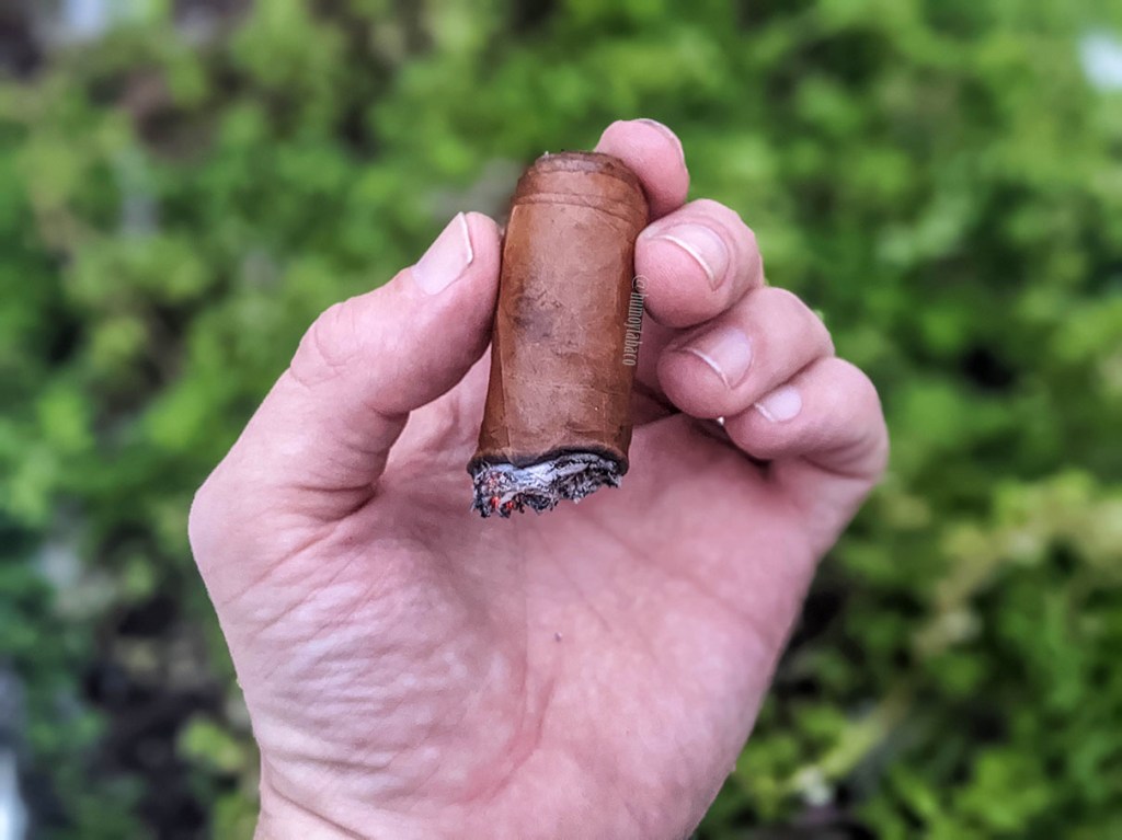 Los sabores de tierra son el cambio más significativo en el último tercio, tomando un matiz como de petrichor al inicio del tercio, pero no lo acompañan hasta el final, mientras que la sensación picante aumenta un toque y el pan recién horneado también está presente y afortunadamente acompaña los aromas en el retrogusto también, así que no es solo pimienta ahí. La intensidad y la fortaleza se reducen en las últimas caladas de este White Series, marcando así lo que el master blender indica como el final del cigarro y aunque todavía quedaba algo de fumada, en verdad no había mayores sabores que apreciar y lo que había de cigarro mantenía su esponjosidad y se calentó bastante, lo que me hizo dejarlo cuando marcaba una hora y 50 minutos de fumada.
