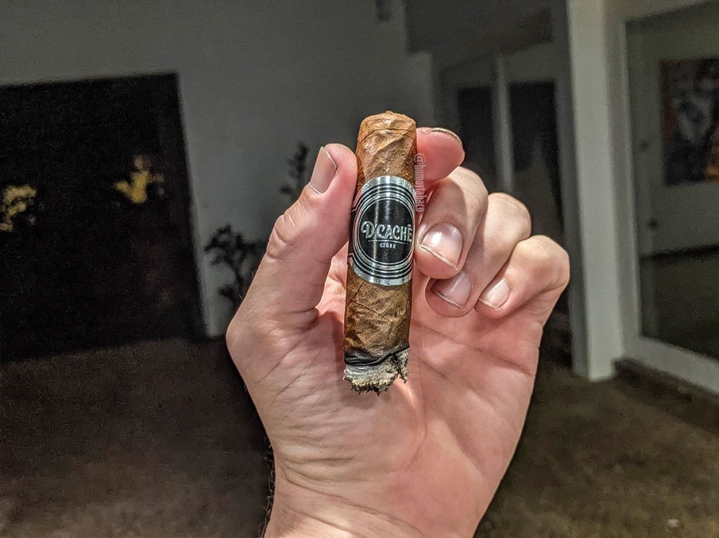 En su segundo tercio el D’Caché comienza a cumplir esa promesa contraria de suave a medio, siendo más como medio a suave. Por un tema de calor y detalles de la foto es que se notan las imperfecciones en la capa que no se veían antes, pero también puede estar relacionado el hecho que está lloviendo detrás de mi mano y puede haber mayor humedad en el ambiente de lo que la capa está dispuesta a absorber para mantenerse lisa. Precisamente, los sabores en este tercio son similares a los del anterior, pero menos fuertes y más especiados o al menos esa nota de regaliz está más presente y es quizá lo más fuerte en temas de intensidad, seguido de chocolate y madera. En el retrogusto es pimienta suave y regaliz un tanto más fuerte, con una quemada que tiende a desviarse un poco pero también tiende a corregirse.