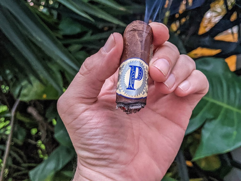 Así como el que no ve trailers de películas antes de sentarse a verlo, yo trato de no investigar mucho sobre el cigarro que me voy a fumar para así tomar mis notas más libremente. Es luego cuando me siento a hacer la reseña que investigo un poco sobre cada cigarro y así como me impresionó que este llevara capa Sumatra (aunque su nombre ya me lo había develado), también me impresionó que no fuese nicaragüense, pues la pimienta se hace notar desde la primera calada. No es excesiva, pero está muy presente y no es el sabor principal; eso corresponde a las notas de café y caramelo, que para el momento de la imagen son acompañados de nibs de cacao, tierra y madera. En el retrogusto hay una abundancia de sabores dulces de marshmallow y pimienta que empujan a que la intensidad de sabores en este tercio alcance la media, con una fortaleza ligeramente por debajo de media-alta. En términos técnicos, pareciera que una sección de la capa no está perfectamente pegada al cigarro pero no es algo que me dé problemas ni que afecte las caladas, al menos por los momentos. La ceniza, tiro, humo y quemada se encuentran en los rangos de lo correcto y voy disfrutando mucho la fumada.