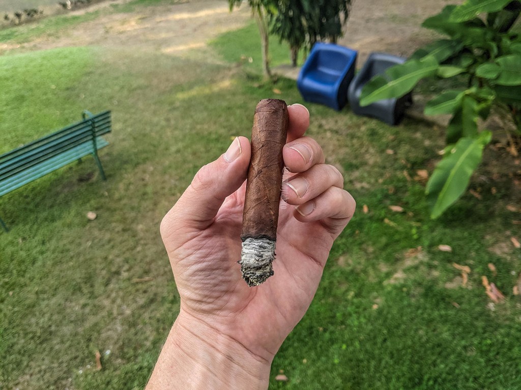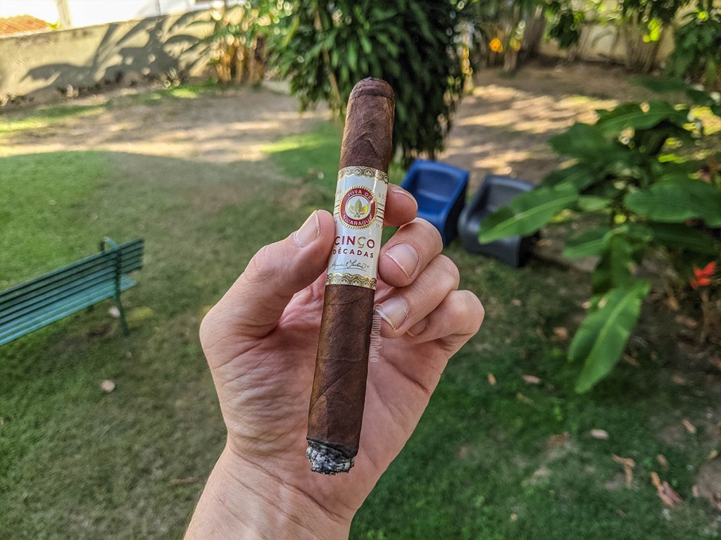 En el último tercio no hay grandes cambios en el sabor, aunque sí hay una sensación más cremosa en ellos y la adición de un sabor a madera que no creo que estaba ahí antes, o al menos puede que esté presente desde el punto medio. El retrogusto es ligeramente más dulce y creo que es ahí de donde parte esa nota cremosa pero lleva la intensidad del sabor a media-alta y la fortaleza a alta, pero el hecho es que me toma tres horas acabar con el Cinco Décadas y después de tanto tiempo con el mismo cigarro, es inevitable sentir los efectos de la nicotina y una cierta molestia con que el cigarro no se quiera terminar. No me malinterpretes, pues el cigarro está fenomenal e incluso mejor que en vitola toro, pero simplemente requiere mucho tiempo que no siento que le quiero dedicar. Definitivamente existen cigarros para cada persona y cada tiempo y fumadas tan largas no van conmigo, pero eso no es defecto del cigarro.