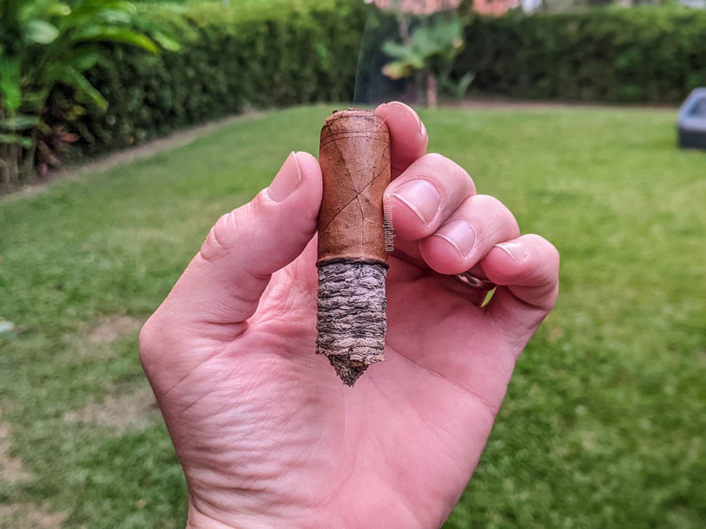 En el último tercio del Palomino Connecticut, la sensación de tierra seca es un poco más prominente y con ella la sensación seca también. Por ello, el cigarro parece haber perdido algo de esa sensación cremosa, pero no desaparece por completo. Como la ceniza se mantiene bien colocada sobre el cigarro y el humo es abundante, trato de espaciar más las caladas y esto rápidamente resuelve el tema de la sensación seca y vuelve a ser cremoso, aunque no a niveles del segundo tercio. Los sabores no varían mucho, manteniendo los de madera como principales, pero con cantidades muy decentes de crema, caramelo, almendras y canela, y su sensación picante tanto en paladar como en retrogusto. Para mi sorpresa, el Palomino Connecticut dura una hora y 25 minutos. Bueno, fue sorpresa la primera vez, pero después de aproximadamente 8 cigarros, lo que me sorprende es la consistencia.