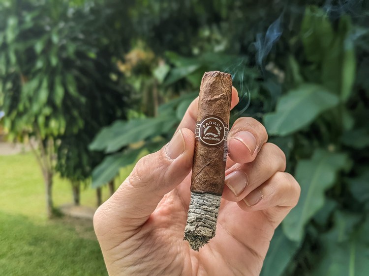Pero para lo clásico y raro del Londres, se ve como un cigarro de baja calidad o al menos su capa es muy accidentada y decolorada en secciones. Los aromas son los que espero y me hacen olvidar los detalles que pueda tener el cigarro, pues incluyen los típicos de la marca: establo, paja y caramelo. Lo pico con la doble hojilla, porque en realidad no sabría con qué picarlo si no es eso y los aromas en frío son muy agradables a pimienta, té negro y paja. El tiro se siente muy bien y la experiencia de un Padron con un cepo reducido realmente me llena de emoción y expectativa.