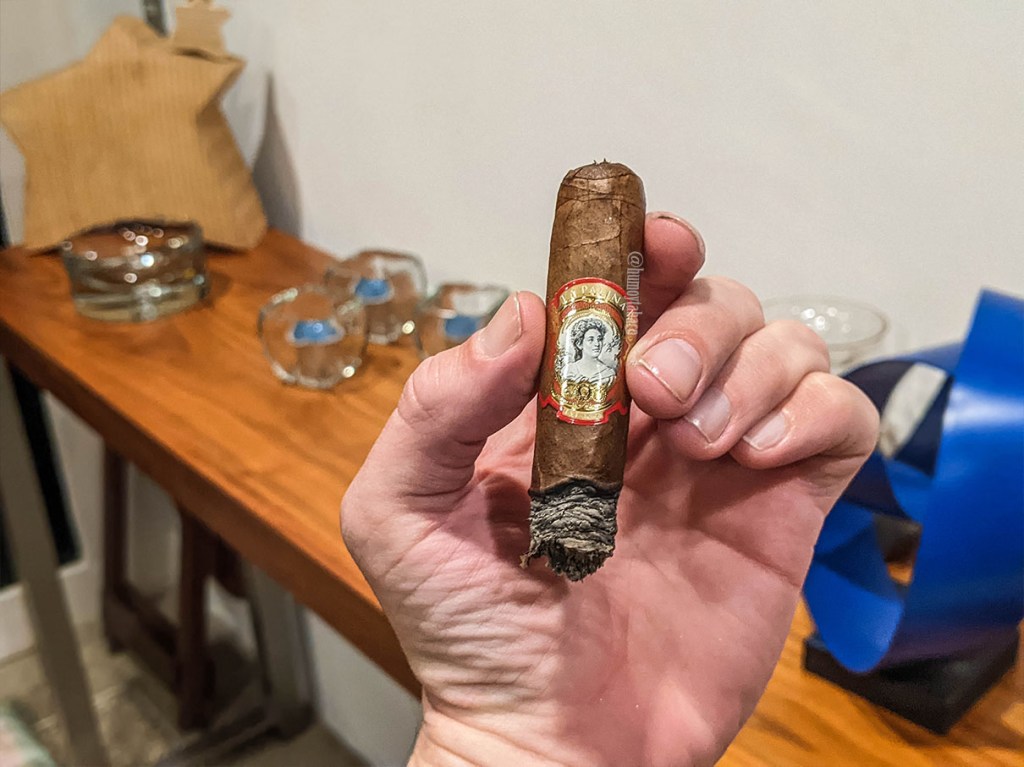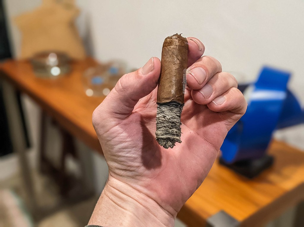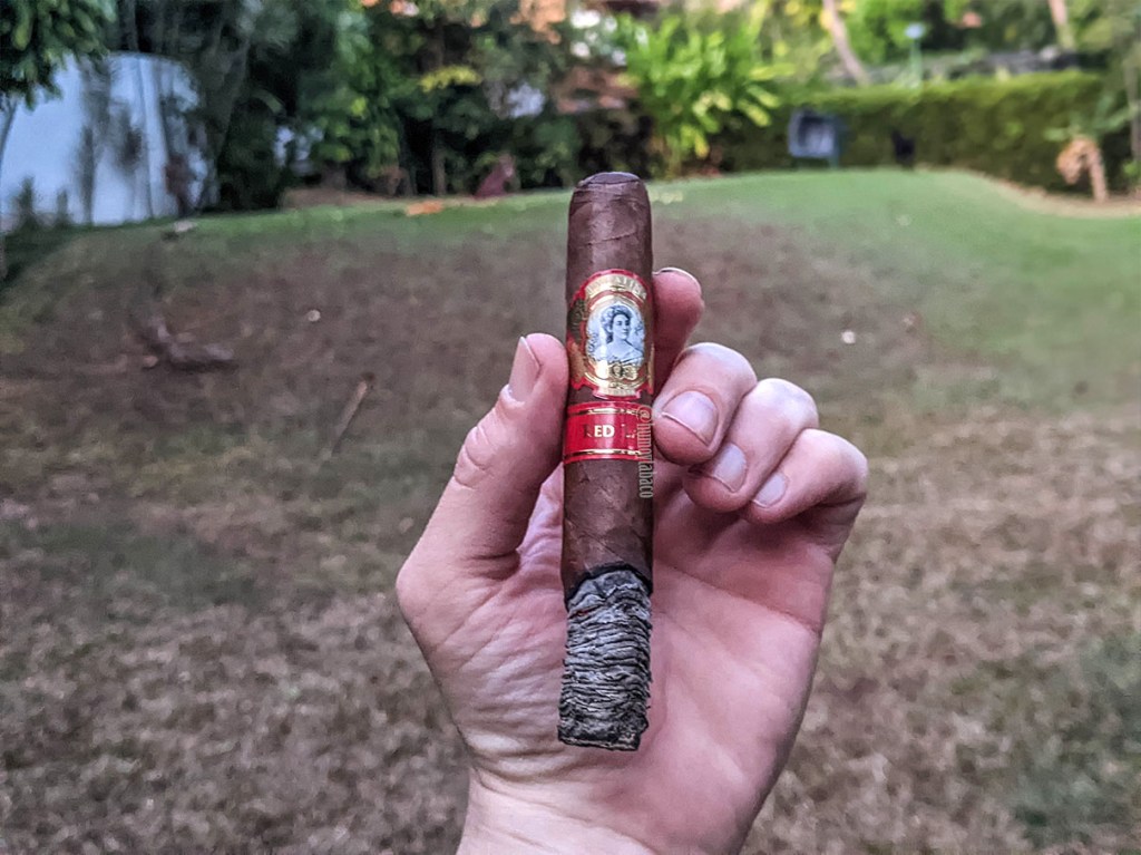 En el último tercio los sabores no tienen mayor intensidad, pero sin duda destaca el de pimientos, seguido de especias, dulce (dátiles todavía), chocolate, caramelo y madera. La ceniza se vuelve a sostener un poco pero la intensidad de los sabores de pimienta se reduce, lo que hace que el cigarro se sienta más suave. Es a mediados de este último tercio y casi como preámbulo de la sección final que el Red Label fortalece un poco ese sabor a madera y lo hace casi dominante del tercio, pero estando en este punto, ya no es mucho lo que esperaba ni lo que podía otorgar el cigarro, pues la deformación del mismo y el calor de lo que iba quedando dificultaban disfrutarlo más, pero con excepción de ese detalle de fabricación, toda la fumada fue muy agradable.