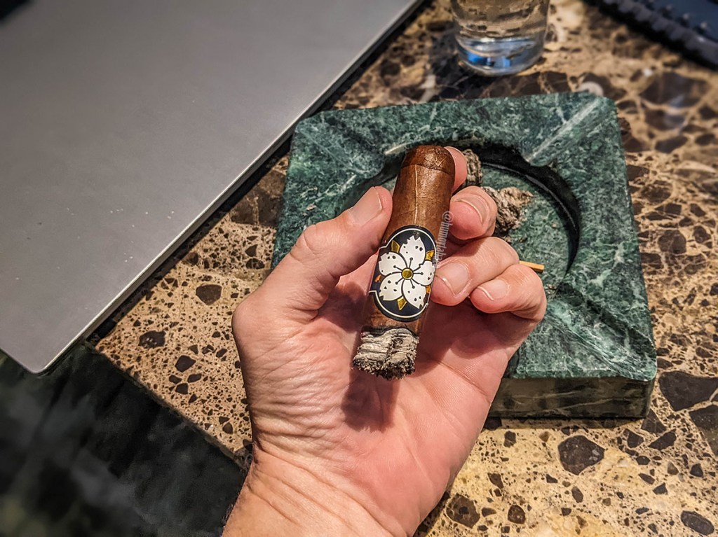 El lugar donde disfruto de este cigarro no es mi lugar habitual, pero espero que se convierta en uno de ellos, pues el ambiente se presta mucho para disfrutar de un buen cigarro. El Farce Maduro comienza con fuertes dosis de pimienta, que se sienten en garganta, lengua y nariz, acompañado por notas más suaves de madera de cedro, chocolate y notas saladas. El anillo de combustión se comporta muy bien y durante el primer tercio no me toca soltar la ceniza ni una sola vez. La pimienta se torna un poco abrumadora cuando supero la mitad del primer tercio y me obliga a dejar el cigarro a un lado durante un rato, lo que me lleva a tomar agua gasificada y simplemente sobrevivir el tercio. La intensidad es media-alta, al igual que la fortaleza.