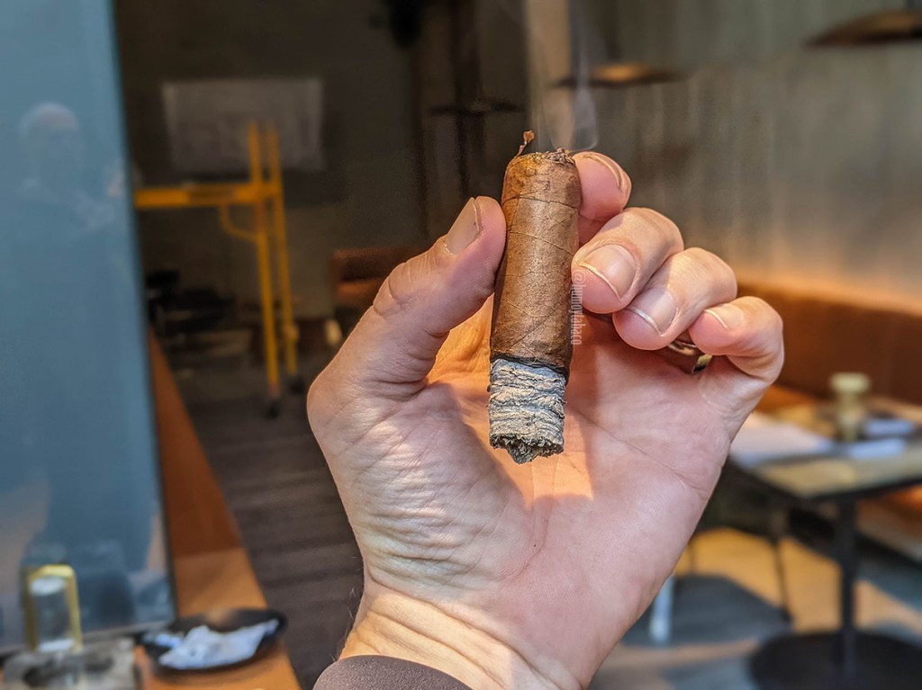 En el último tercio regresan algunos sabores agradables, aunque no a borbotones. Está el sabor a chocolate como el que más le doy la bienvenida de vuelta e incluso hay notas de frutos secos, estas últimas algo más intensas y casi definiendo el último segmento del cigarro. La sensación amarga no se va y es ella la que lleva el protagonismo, haciendo que este último tercio sea medianamente menos desagradable que el anterior, pero no es algo que llamaría una razón suficiente para seguir quemando el cigarro, razón por la cual al cumplir una hora y 10 minutos, pero todavía con algo de fumada por delante, dejo el 125 de lado, ya condenado a no cambiar más. La intensidad y fortaleza se mantienen igual, mientras que el tiro sigue bueno, con humo abundante.