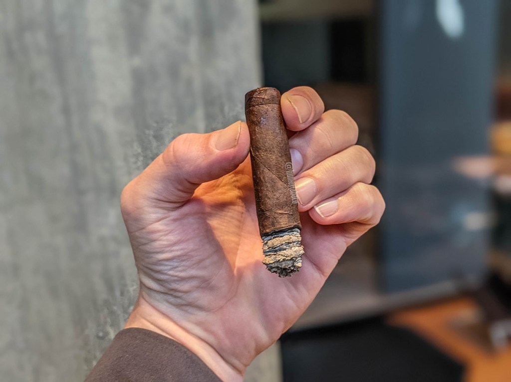 El cigarro desprende humo abundante después de cada calada y en construcción se comporta a la perfección. En el segundo tercio sus sabores a chocolate, café, regaliz, madera y maní garrapiñado son ricos y concentrados, y para el momento que llego a la mitad del cigarro los sabores a chocolate se sienten malteados, siendo ese el único cambio realmente notable. El retrogusto sigue siendo de madera, pimienta y esa nota mineral de cobre, aunque es una que está desapareciendo y es precisamente con esa sensación malteada del chocolate en el paladar que siento a la mitad la que marca la desaparición del cobre en el retrogusto. La ceniza sigue siendo muy blanca y bien situada sobre el cigarro, al tiempo que le doy un espacio bastante prudencial a cada calada. La intensidad es media-alta, con una fortaleza similar.