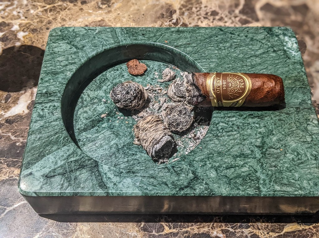 Siguiendo la tendencia de darle la oportunidad a todos los sabores de ser principales, en el último tercio son los de tierra los que más se destacan, pero son los de pimienta y toronja los que se aprecian mejor entre los secundarios y los de chocolate diría que desaparecieron del todo, aunque se presentan de manera muy sutil en el retrogusto, que sigue siendo dominado por la pimienta, pero esta reduce su intensidad en el último tramo, lo cual se mantiene igual hasta que dejo al cigarro morir con dignidad luego de una hora y 55 minutos de haberlo encendido, con una intensidad media y una fortaleza similar. El anillo de combustión siguió desviándose, pero no recuerdo haberle dado un retoque continuo, sino más bien muy puntuales para corregir cualquier imperfección. La cantidad de humo siempre fue abundante pero controlable, gracias a que el tiro nunca se soltó de más.