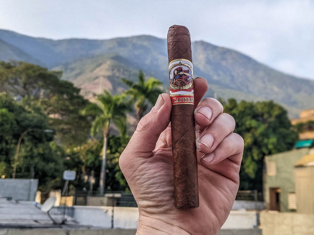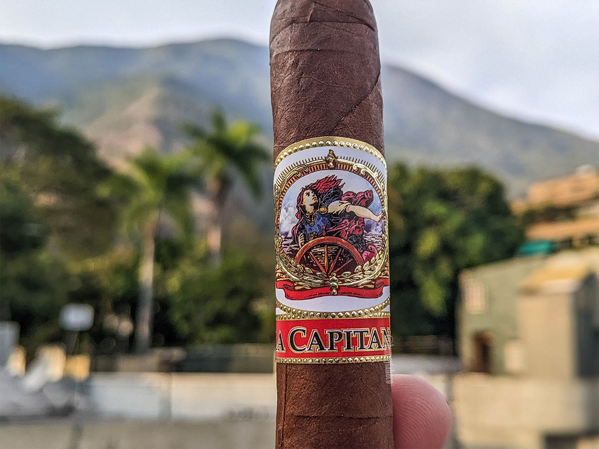 La Capitana es un puro nicaragüense con capa Habano y medidas de 6 x 50 en su vitola toro, con una apariencia respetable, colores uniformes y al menos me da la sensación que la fumada será agradable. Tiene algunas venas y aunque mucha gente pensará que mientras más venas tenga, menor será la calidad de la hoja, en realidad las venas aportan sabor, así que son sinónimas con una mayor intensidad de sabores. No obstante, las venas le quitan sutileza a la capa, así que escoger las hojas ideales es un equilibrio entre lo que se ve y lo que se siente, pero la capa también tiene un brillo notable y eso es un aspecto positivo del cigarro. Los aromas en esta capa son de chocolate negro y bosta, con notas muy similares en el pie. La calada en frío presenta bosta, tierra mojada y algo de aserrín, y aunque estos pueden ser aromas agradables (y lo son), tampoco son muy diferentes a una gran mayoría de cigarros que existen en el mercado.