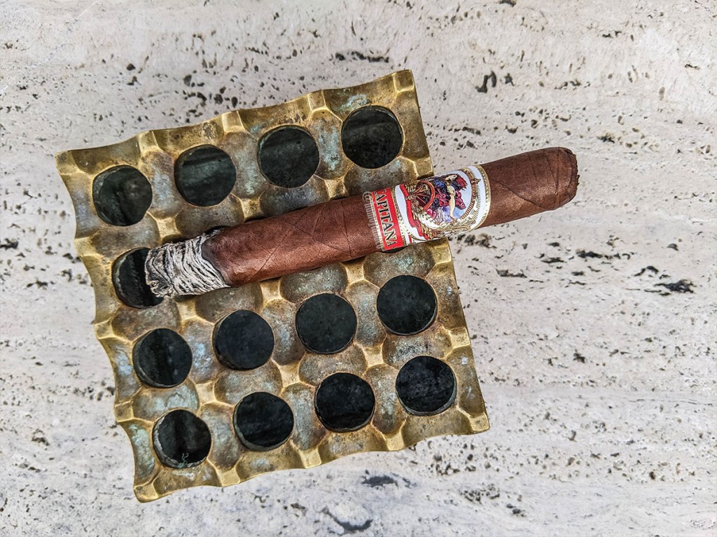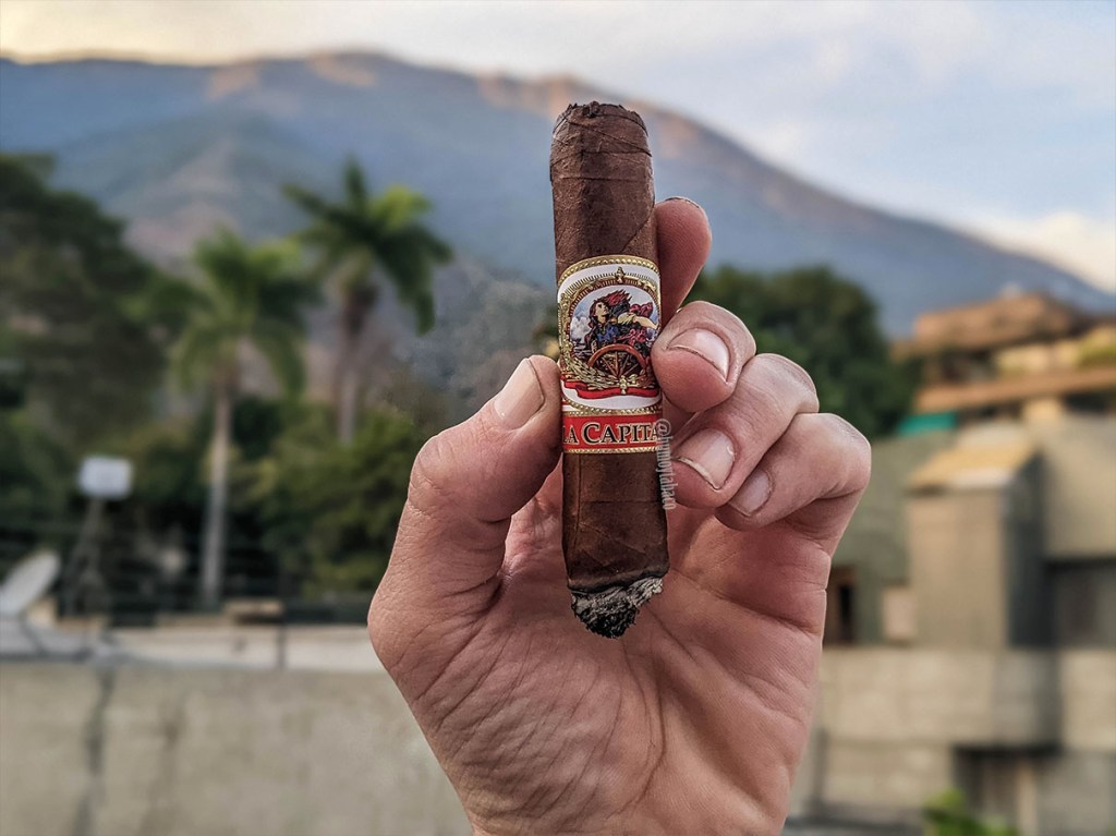 Nuevamente el La Capitana destaca la gran diferencia entre lo que se ve y lo que se siente, como dije en el párrafo anterior. Porque por un lado el cigarro se ve muy bien, brillante, con un anillo de combustión decente (aunque no muy recto) y una ceniza bien formada. Pero los sabores son realmente neutros, aunque hay indicativos de sabores que llegan a ser agradables, como notas suaves de pimienta y otras herbáceas y vegetales más fuertes, pero también lo que puedo describir solamente como papel. En cierto modo me molesta un poco que los aromas en frío prometían algo que una vez encendido no está ahí, pero también pasa que es el primer tercio y vamos a ver cómo va evolucionando. Pero por lo pronto, no promete mucho.