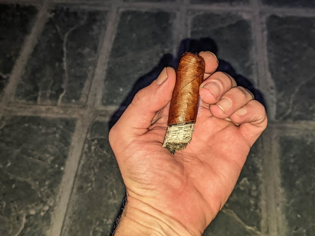 Nada nuevo para el último tercio, donde lo mejor fue llegar al final del cigarro. La experiencia fue exacta a la del tercio anterior, con la excepción que la fortaleza aumentó un poco y aunque nunca se hizo más agradable, sí llegó un punto en que la nicotina era tanta que debí dejar el cigarro a un lado. Afortunadamente eso no le restó nada a la experiencia, sino que fue más como una bienvenida a finalmente dejar el cigarro de lado, 50 minutos después de encenderlo.