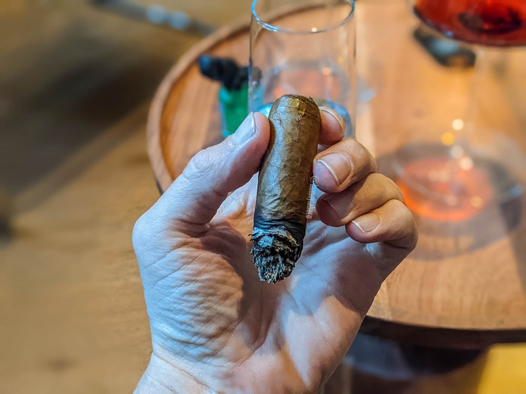 Más o menos desde la mitad del Blend No. 2 hasta unos 10 minutos después de hacer esta foto, el cigarro se apagó unas 4 veces más. El tiro se hizo imposible y para mantenerlo encendido tenía que pasar no más de 10 segundos entre caladas. Por supuesto, eso no ayudó al cigarro ni colaboró con los sabores, por lo que al poco rato de esta foto decidí dejar el cigarro a un lado. En total la fumada fue de una hora y 10 minutos, que siento que me faltaron al menos 20 minutos más, pero el cigarro no lo permitió. La fortaleza aumentó un toque más después del punto medio, pero con cada apagada y reencendida se sentía más nicotina y cuando finalmente se apagó una quinta vez, básicamente lo agradecí.
