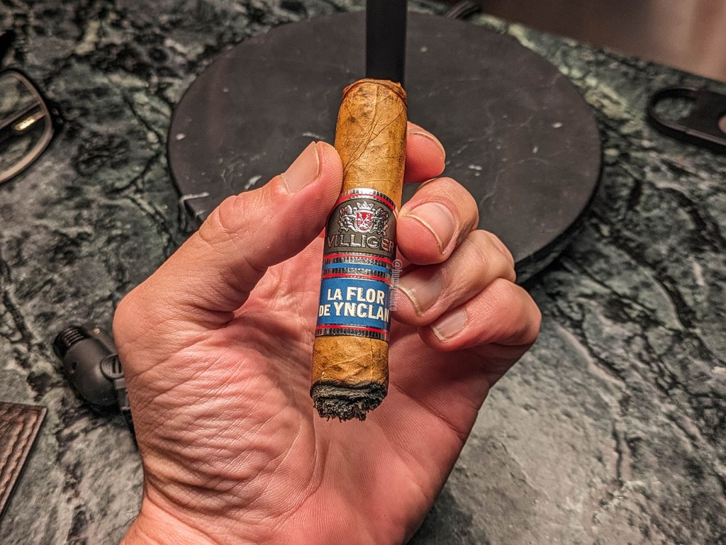 Habrán quienes se pregunten cómo es que después de la «debacle» que tuve con Villiger recientemente, que siga probando sus productos. Me explico: compré un sampler de cinco cigarros distintos de la marca y, para ser honesto, ninguno me gustó. Hubo dos que estaban decentes, pero ninguno de ellos lo volvería a comprar. No obstante, este La Flor de Ynclan no estaba en ese sampler y creo que es el único Villiger que me ha gustado tanto como para comprarlo de nuevo. Lo reseñé en robusto en 2019, luego que en 2017 estuviese en el décimo peldaño del Top 25 de Cigar Aficionado, y la verdad es que me pareció decente (le di 83 puntos). Desde entonces no había probado muchos, salvo el sampler. Pero a principios de este año la página Serious Cigars anunció que cerraba y muchos de sus productos estaban rebajados hasta la fecha de cierre. Buscando entre lo que ofrecían, encontré un 5-pack de este La Flor de Ynclan en Churchill, en un precio increíble (creo que $14 en total), así que no lo dejé pasar.