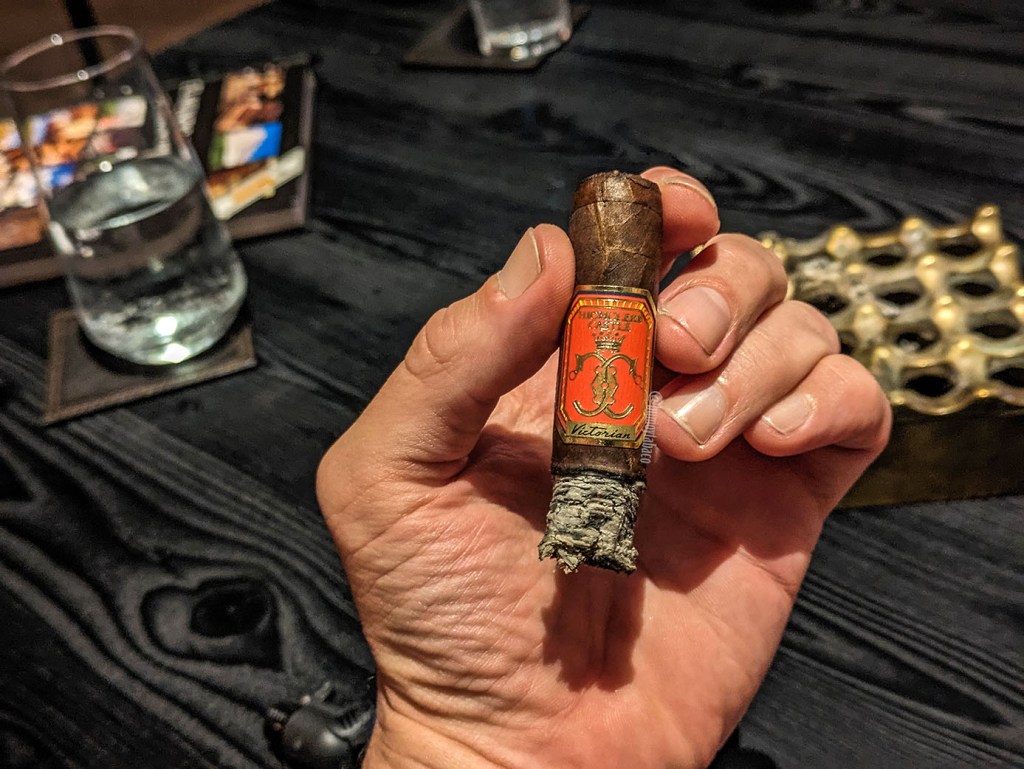 El último tercio del Highclere Castle Victorian presenta ese mismo refinamiento y la sensación que estoy fumando un cigarro que debe ser disfrutado en un salón, y es precisamente en donde lo estoy fumando. El sabor de madera adquiere una tonalidad más seca pero menos intensa, llegando casi a ser un sabor secundario al inicio de este tercio y ya casi olvidado al final de la fumada, pero los sabores de pan tostado y pimienta siguen muy presentes, pero con la adición de vainilla y nuez moscada, pero el sacrificio en lugar de estos nuevos sabores es la desaparición de lo que se sentía como crema pastelera hasta este momento. Cuando marco dos horas de fumada este cigarro ya no da mucho más, pero llegó hasta este punto con una intensidad media-alta y fortaleza media, sin problemas de quemada ni de anillo de combustión, pero con un humo no tan abundante como todo lo anterior me haría pensar, pero no obstante muy satisfactorio.