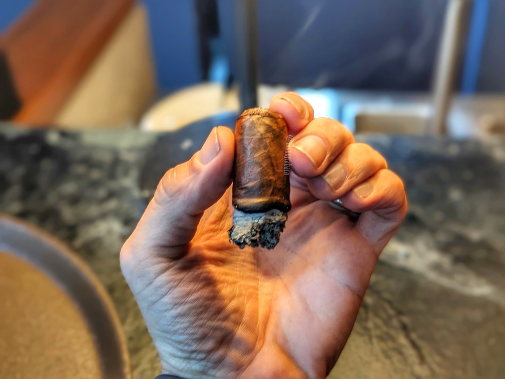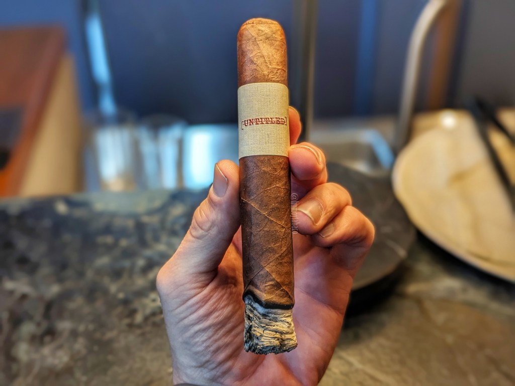 Al Untitled le cuesta llegar al último tercio, llevando una marcada tendencia a quemar mal, pero los sabores son agradables y aunque la fortaleza se reduce a media-baja, la intensidad se mantiene en media y tiene conatos de alcanzar posiciones más altas. En este tercio es el sabor de madera de roble el que alcanza el liderato, pero el café aún se mantiene al igual que la pimienta, por lo que hay momentos que se siente como un cigarro de tripa corta, en el sentido que no hay una gran evolución a lo largo de la fumada, sino sabores consistentes y continuos. Me toma casi dos horas fumarlo hasta el final, aunque llega un punto más o menos unos 5 minutos después de hacer la foto que aparece arriba en donde se apagó y no quise reencenderlo.