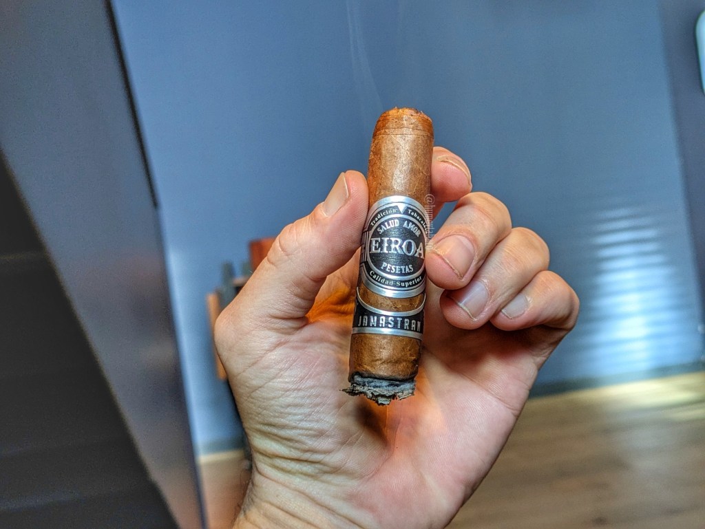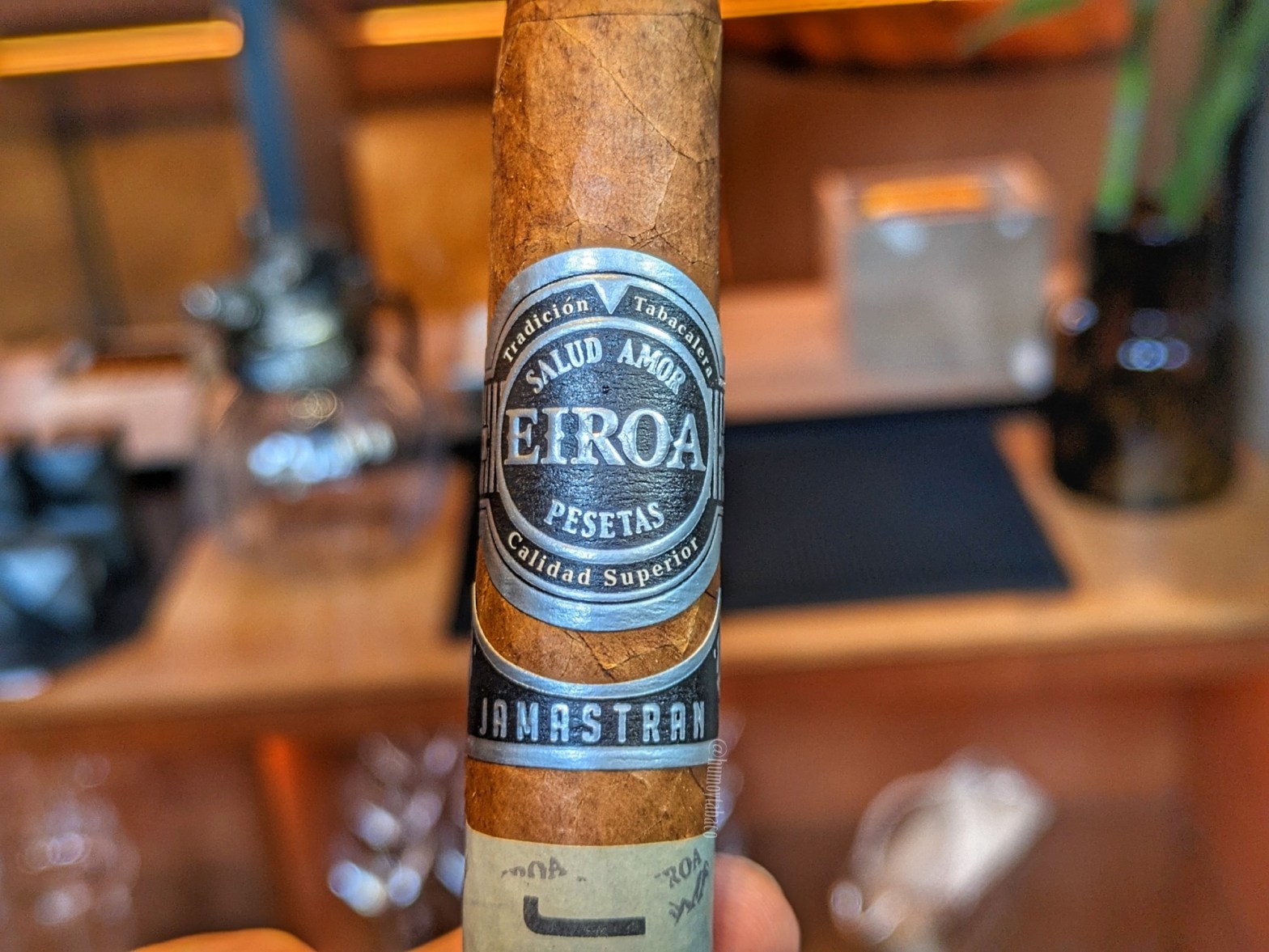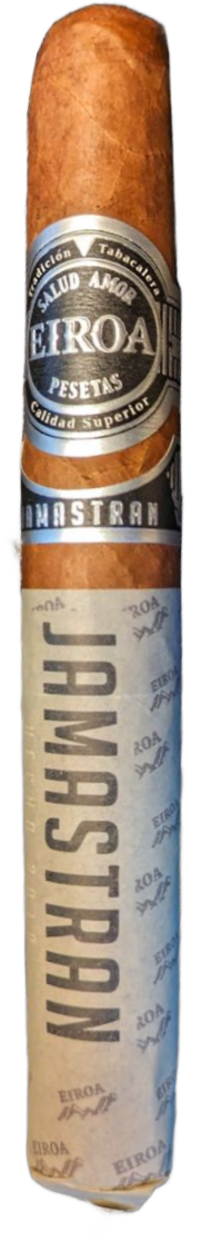 Así como existe una gran cantidad de cigarros que reciben su nombre por donde son fabricados o por las hojas que contienen, como Nicaragua, Honduras, Estelí u Ometepe, era solo cuestión de tiempo que existiera un cigarro llamado Jamastran, aunque este de Eiroa no es el primero. Pero sí destaca en su información que todo el tabaco que contiene viene del valle de Jamastran, en Honduras. Se trata de una línea disponible en solamente dos vitolas, un robusto 5 x 50 y este perfecto llamado 11/18 que mide 6¼ pulgadas de largo por 52 de cepo en su sección más pequeña y 60 en la más grande. Curiosamente, el robusto está disponible en todas partes, mientras que el 11/18 solamente fue vendido a través de las tiendas autorizadas por TAA (Tobacconists’ Association of America). El cigarro fue un obsequio, por lo que asumiría que fue adquirido donde debe ser.